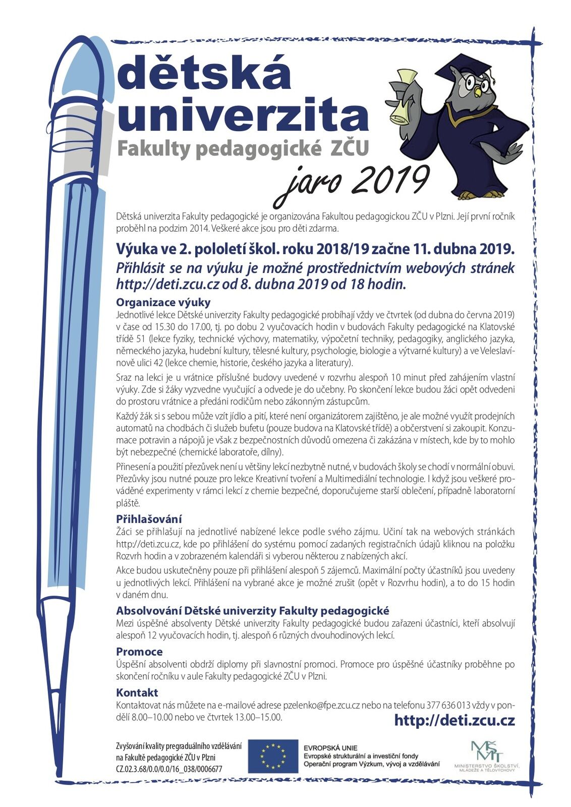 8. dubna od 18 hodin přijímá Fakulta pedagogická přihlášky do dalšího ročníku Dětské univerzity. Výuka začne ve čtvrtek 11. dubna.