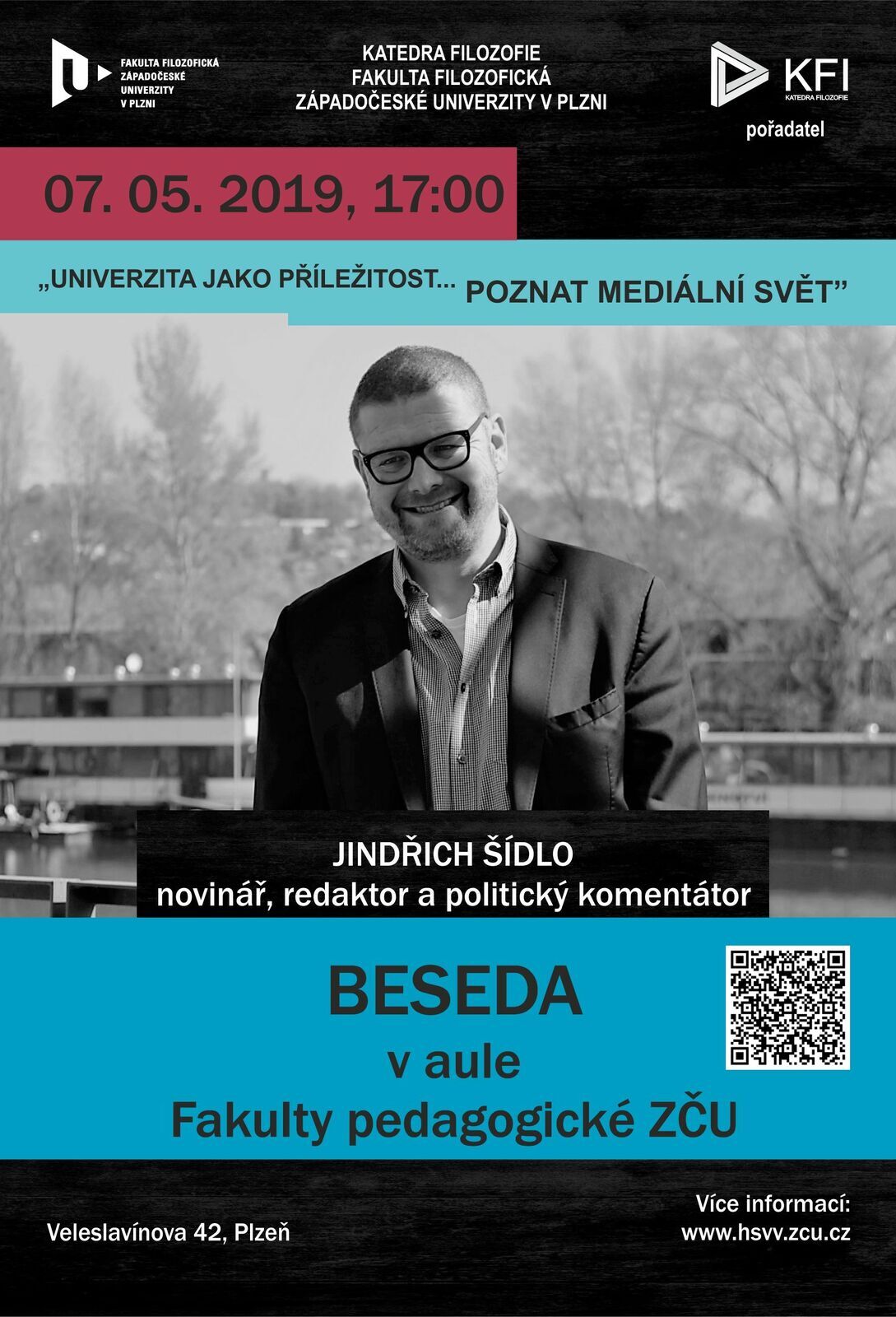 Novinář, redaktor a politický komentátor Jindřich Šídlo působil v týdeníku Respekt, Mladé frontě DNES, Hospodářských novinách a České televizi, v současné době uvádí satirický pořad Šťastné pondělí na portálu Seznam Zprávy. V Plzni bude Jindřich Šídlo debatovat o aktuálních otázkách české mediální krajiny. Řeč bude i o významu humanitního a společenskovědního vzdělání při kultivaci veřejného prostoru.