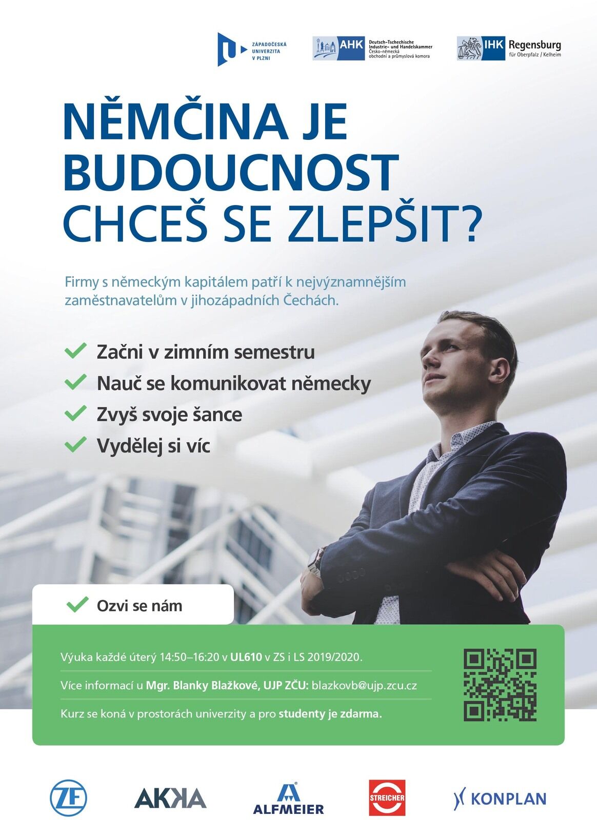 Studenti Západočeské univerzity se budou moci od zimního semestru akademického roku 2019/2020 zlepšovat v němčině. „Začni v zimním semestru. Nauč se komunikovat německy. Zvyš svoje šance. Vydělej si víc,“ oslovuje je kampaň, kterou pod názvem Němčina je budoucnost. Chceš se zlepšit? připravila ZČU a plzeňská regionální kancelář Obchodní a průmyslové komory Regensburg a Česko-německé obchodní a průmyslové komory. Kurzy budou zdarma.