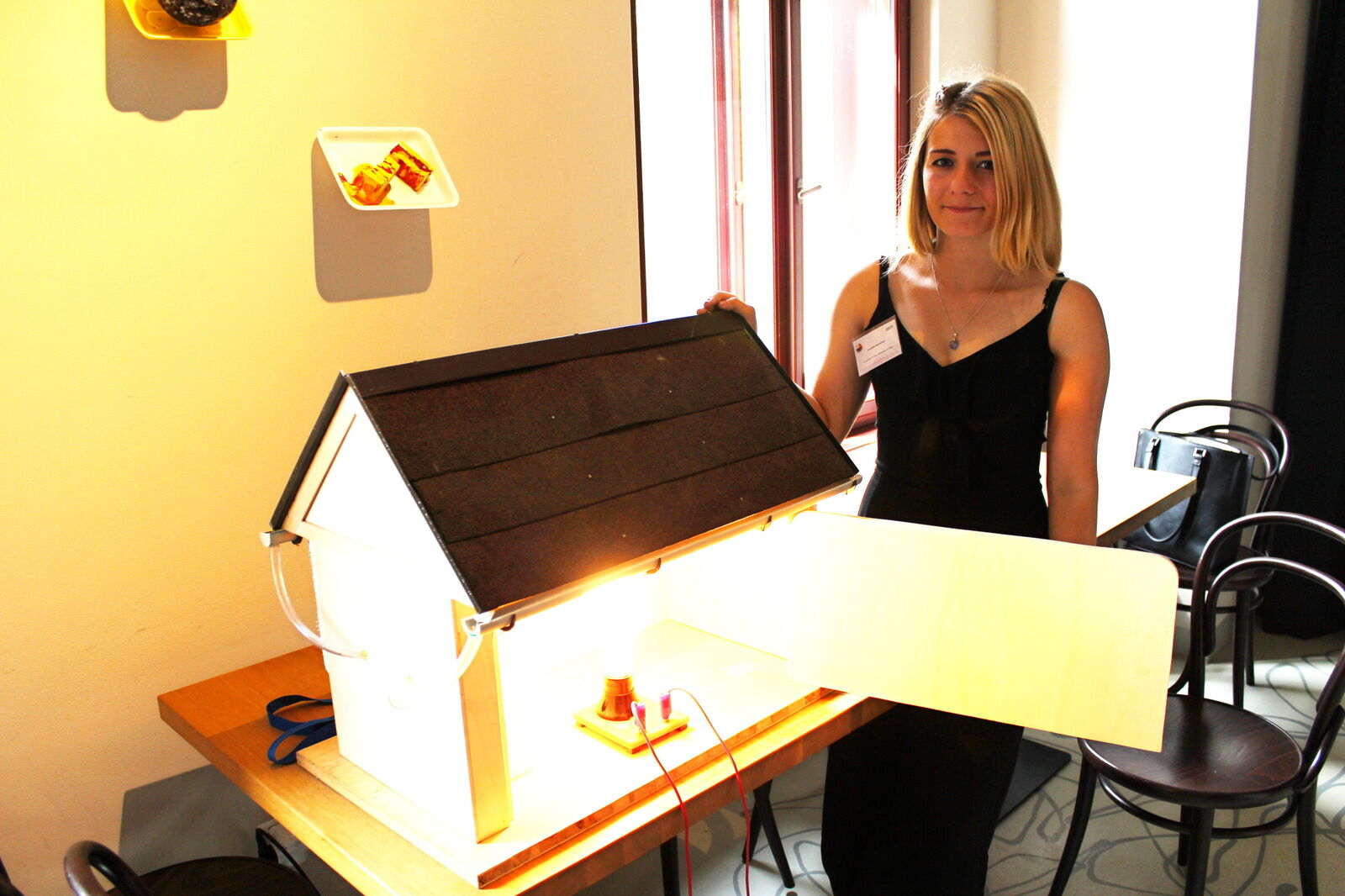 Studentka FPE ZČU Veronika Gabrielová se svým modelem domu pro měření termokamerou.