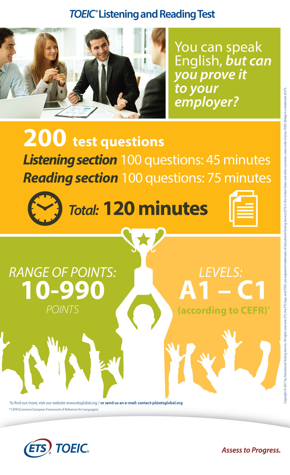 Mezinárodní zkoušky TOEIC (Test of English for International Communication) společnosti ETS Global slouží především jako osvědčení schopností používat angličtinu v mezinárodním pracovním prostředí. Jako doklad o zvládnutí cizího jazyka ji využívá a uznává přes 14 tisíc firem, vládních a akademických institucí ve 150 zemích světa. „Více než dva tisíce velkých mezinárodních společností zohledňuje výsledek zkoušky TOEIC při přijímání nových zaměstnanců a firmy jako například Airbus, Renault či NEC přímo požadují určité skóre ze zkoušky TOEIC při přijímání na konkrétní pracovní pozice,“ uvádí ředitelka Ústavu jazykové přípravy Jana Čepičková.