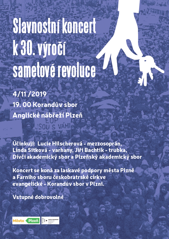 Slavnostní koncert k 30. výročí sametové revoluce se uskuteční 4. listopadu v 19 hodin v Korandově sboru na Anglickém nábřeží v Plzni. Vystoupí Lucie Hilscherová (mezzosoprán), Linda Sítková (varhany), Jiří Bachtík (trubka), Dívčí akademický sbor a Plzeňský akademický sbor.