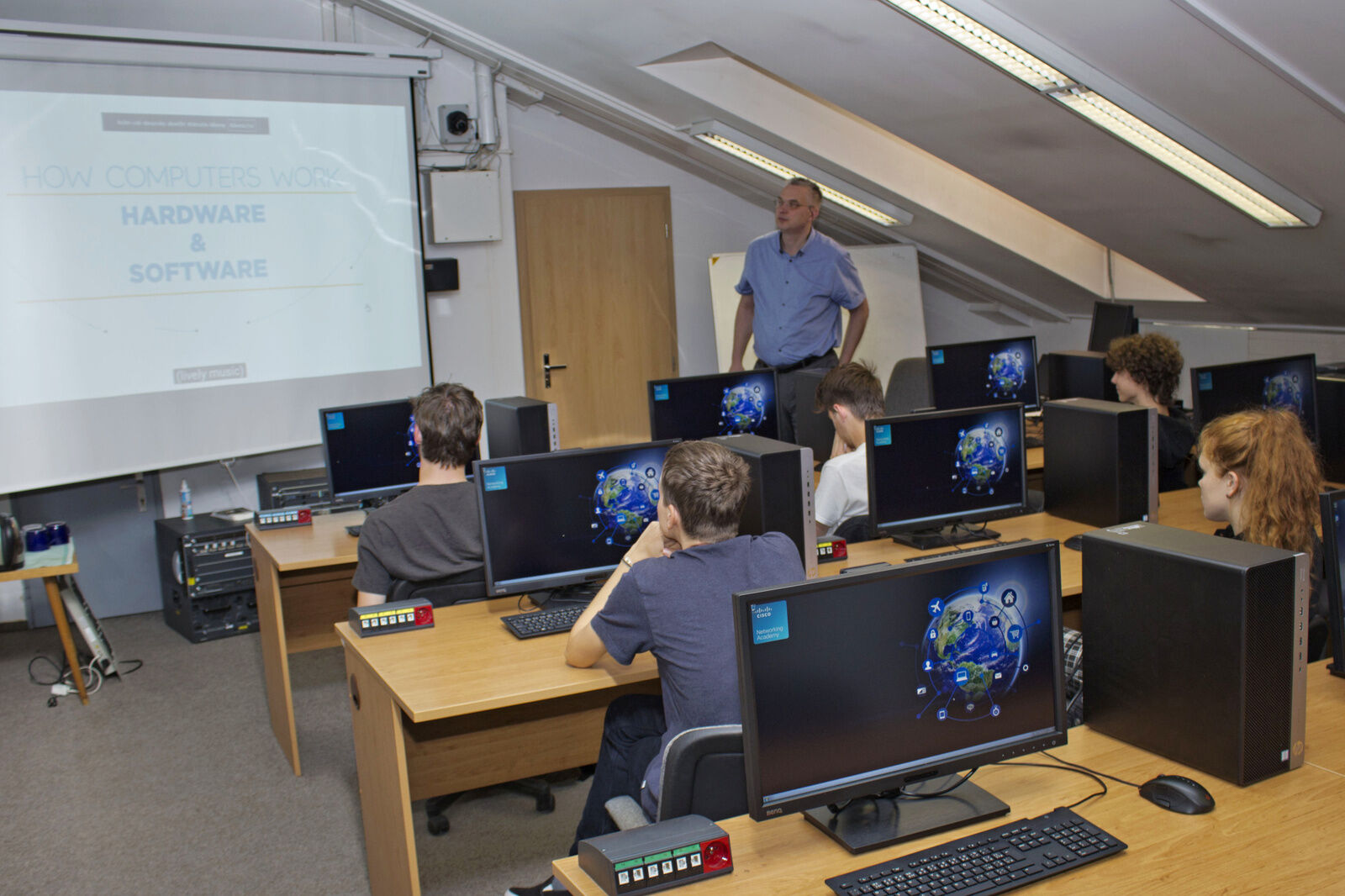 „V první lekci jsme se podívali na to, co vlastně znamená pojem internet věcí a jak fungují počítače,“ popisuje Jiří Bořík. „Abychom nezůstali jen u teorie, rozebrali jsme i skříň stolního počítače, notebooku i serveru a vysvětlili si, jaké jsou rozdíly v jejich konstrukci,“ doplňuje. Náplní dalších setkání je výuka programování v prostředí Scratch, kterou vedou vyučující z katedry informatiky a výpočetní techniky Fakulty aplikovaných věd ZČU. „Abychom měli vazbu na reálný svět, programovat budeme také malý počítač Raspberry Pi, doplněný o různá čidla i signalizaci,“ dodává Bořík. Studenti si tak vyzkoušejí i základní elektrotechnické dovednosti, jako je sestavení jednoduchého obvodu nebo pájení.