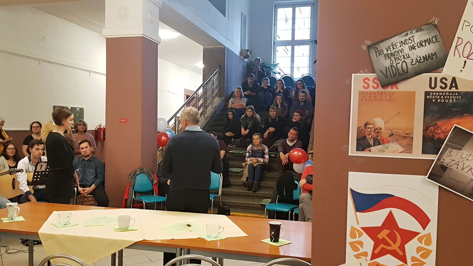 pedagogické z organizace Otevřeno v budově na Klatovské třídě. V úvodu pozdravil účastníky rektor Miroslav Holeček, který připojil vzpomínku na to, jak prožíval listopad 1989.