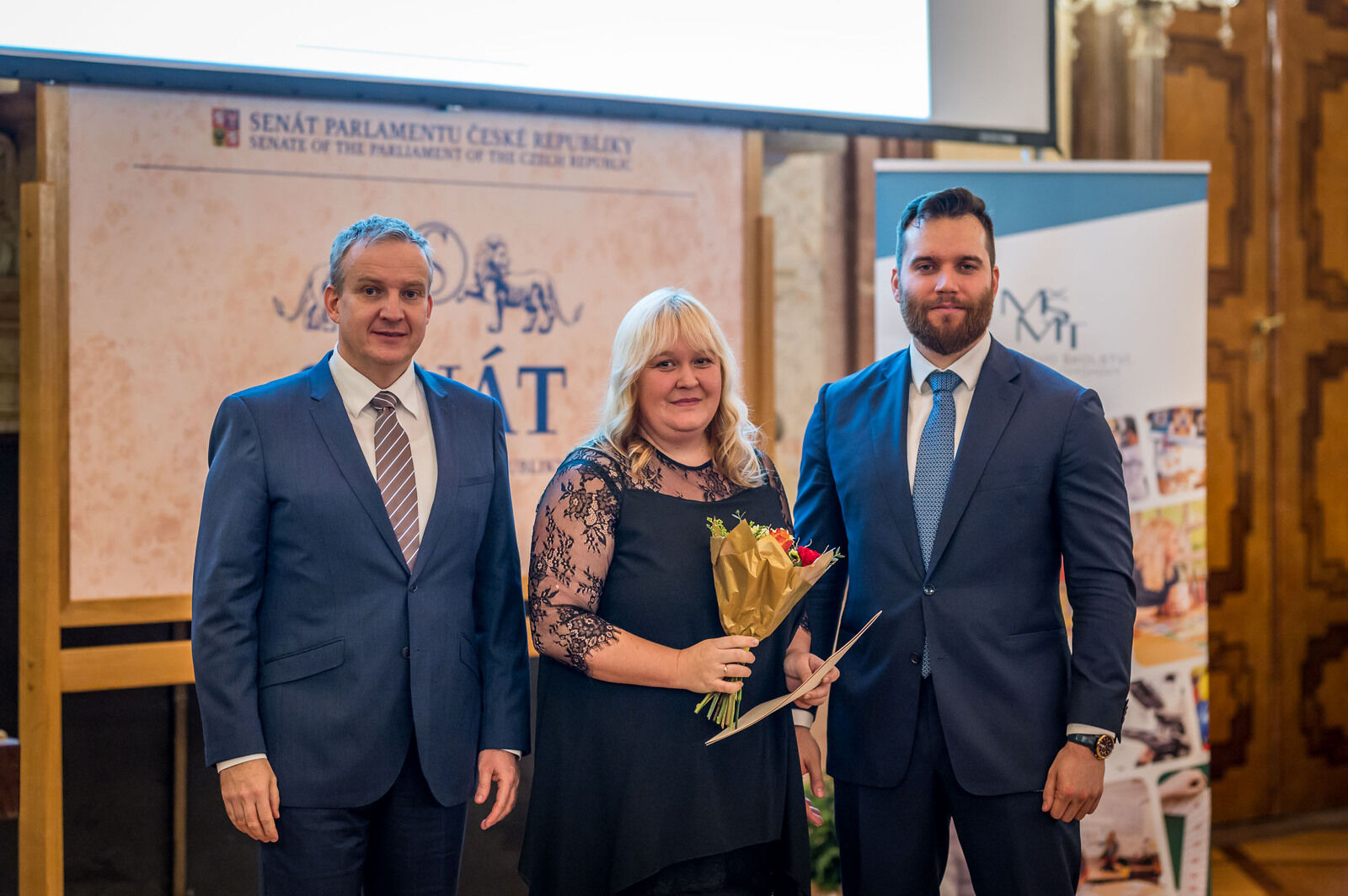 Na snímku jsou (zleva) státní tajemník MŠMT Jindřich Fryč, Lucie Rohlíková a náměstek MŠMT pro vysoké školy, vědu a výzkum Pavel Doleček. foto: MŠMT