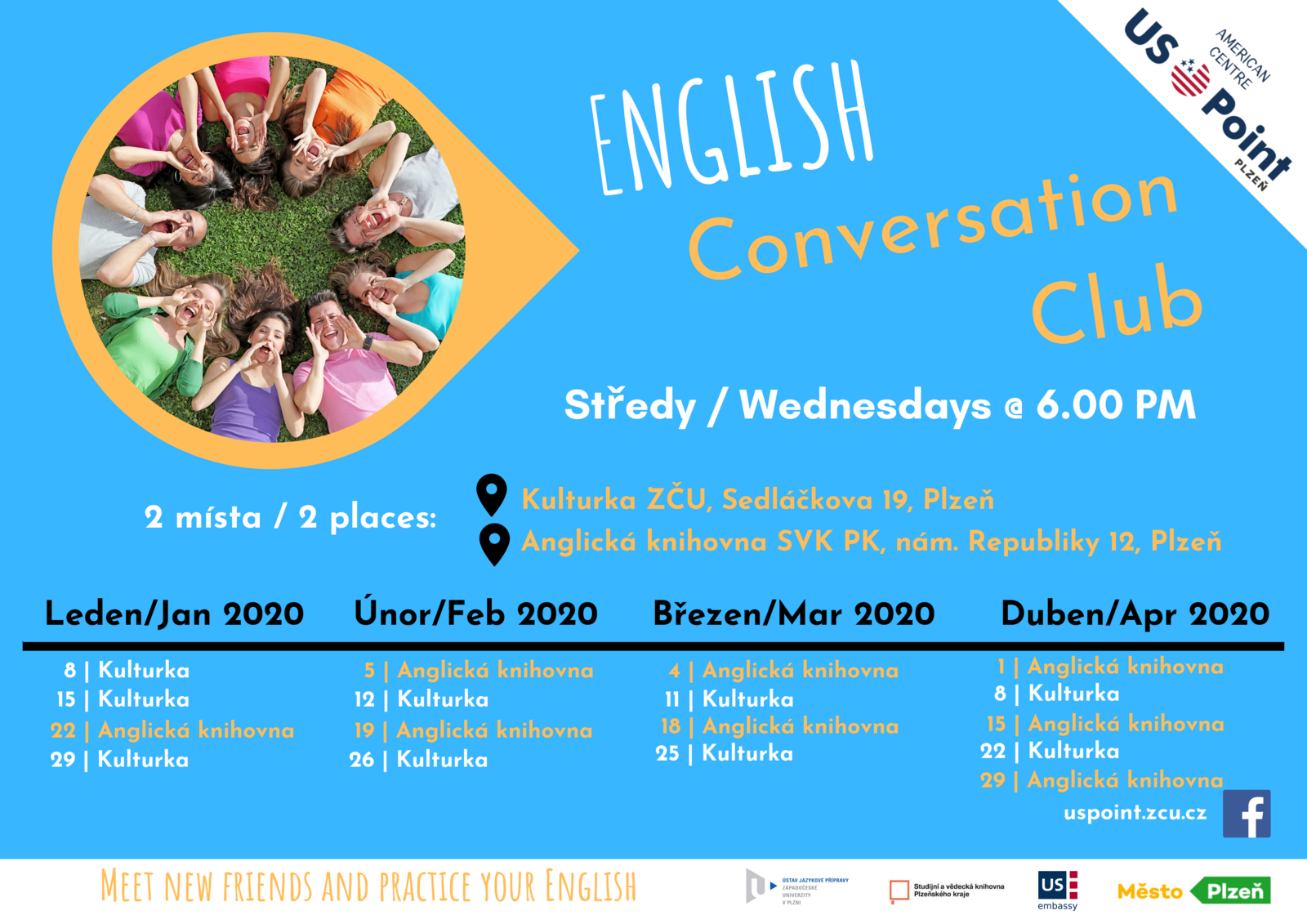 Konverzační klub je vždy ve středu od 18:00 – 19:00 hod. na dvou