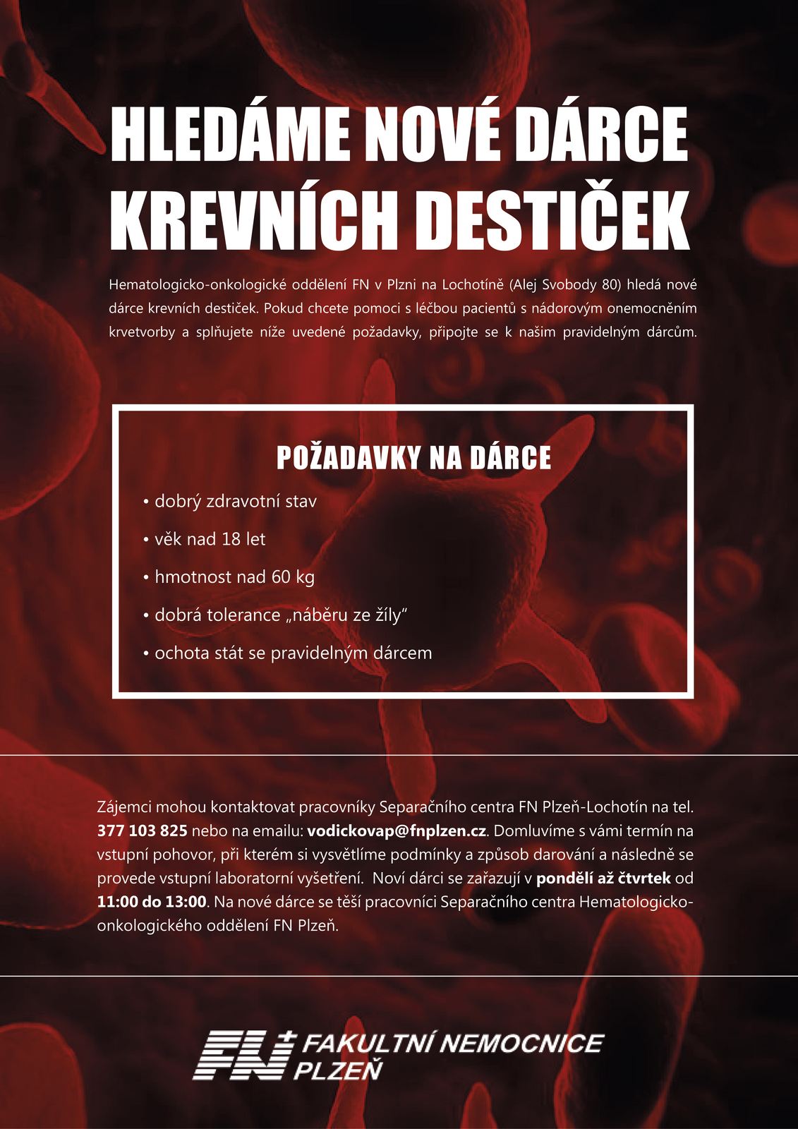Je vám více než 18 let, vážíte nad 60 kg, jste v dobrém zdravotním stavu a hlavně máte chuť pravidelně pomáhat druhým? Hematologicko-onkologické oddělení Fakultní nemocnice v Plzni hledá právě vás. Separační centrum na Lochotíně můžete kontaktovat pomocí informací z přiloženého letáku.