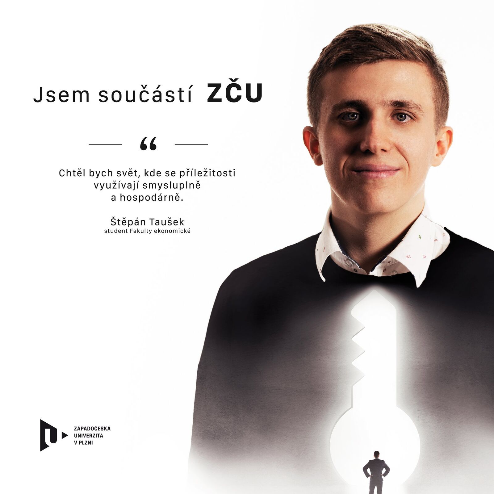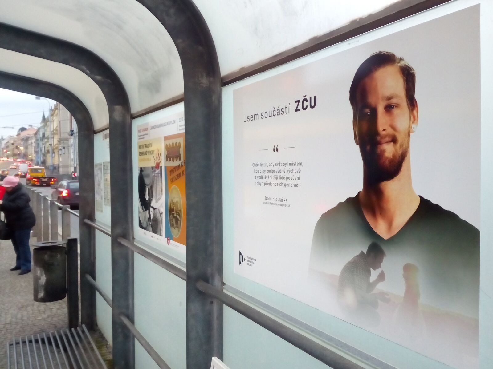Obyvatelé i návštěvníci Plzně a Karlových Varů se od konce minulého týdne setkávají s novou propagační akcí Západočeské univerzity. Díky velkoformátovým samolepkám i plakátům se společným mottem Jsem součástí ZČU mají možnost seznámit se na zastávkách MHD i na osvětlených panelech v ulicích s pěticí studentů Západočeské univerzity, a především s jejich myšlenkami.