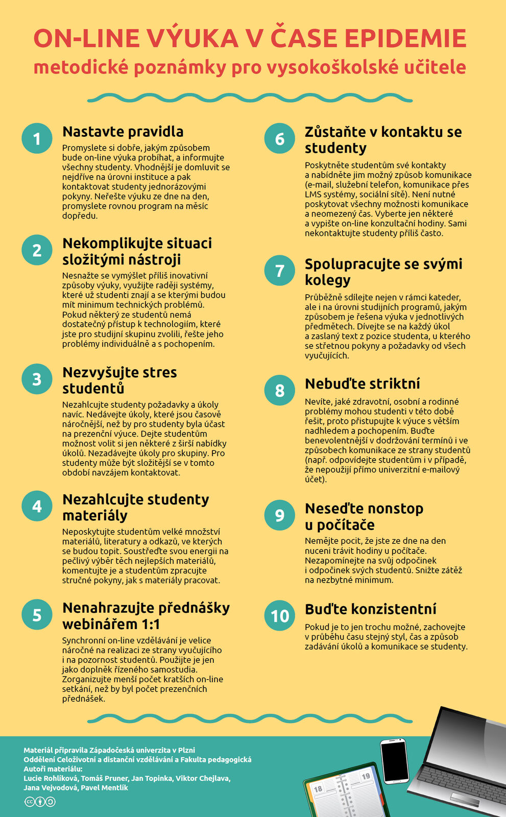 „Často je důležitější nechat studenty pár dní trochu v klidu, aby se vyrovnali s novou situací a pak teprve zahájit výuku. Je také potřeba respektovat, že rodiny mohou mít různé problémy,“ připomíná didaktička z Fakulty pedagogické ZČU. Doporučení pro učitele tak zní: 1. nastavte pravidla, 2. nekomplikujte situaci složitými nástroji, 3. nezvyšujte stres studentů, 4. nezahlcujte studenty materiály, 5. nenahrazujte přednášky webinářem 1:1, 6. zůstaňte v kontaktu se studenty, 7. spolupracujte se svými kolegy, 8. nebuďte striktní, 9. neseďte nonstop u počítače, 10. buďte konzistentní. Každý bod přitom obsahuje krátké vysvětlení. Vše je přehledně a poutavě zpracováno.