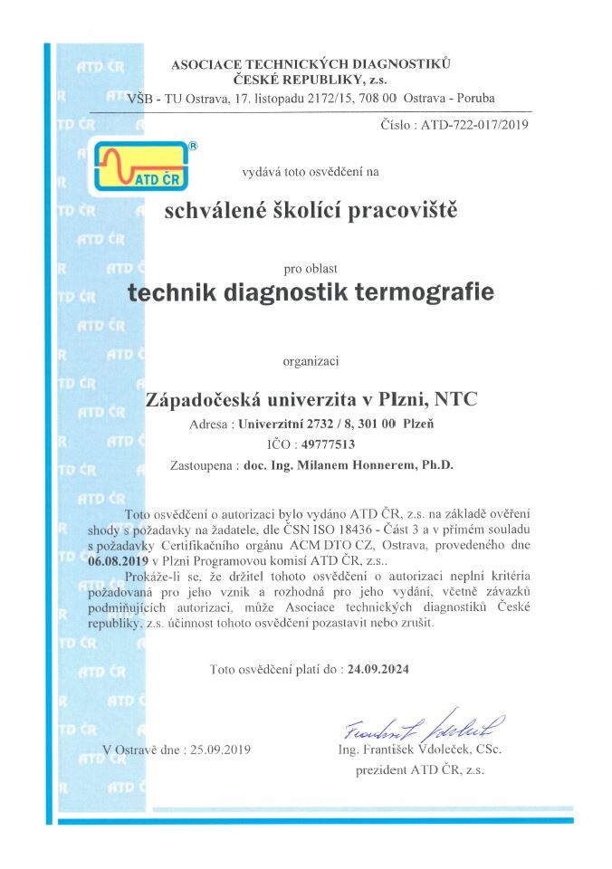 Od září 2019 je NTC schválené školící pracoviště pro pozici technik diagnostik termografie