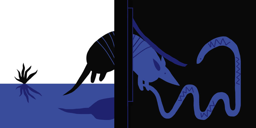 Ve své práci Lucie zvolila dva vizuálně odlišné zvířecí charaktery, které by si vzájemně pomáhaly využitím svých rozdílných vlastností. A tak vznikla ústřední dvojice hada a pásovce. „Bavila mě představa nočního dobrodružství, kdy jsem si mohla hrát se světlem, stínem a tvary, a také si vystačila s minimem barev. Na závěr zbývalo najít iniciátora nebezpečí a napětí. Tohoto úkolu se zhostila domácí kočka a Noční lov mohl začít..."