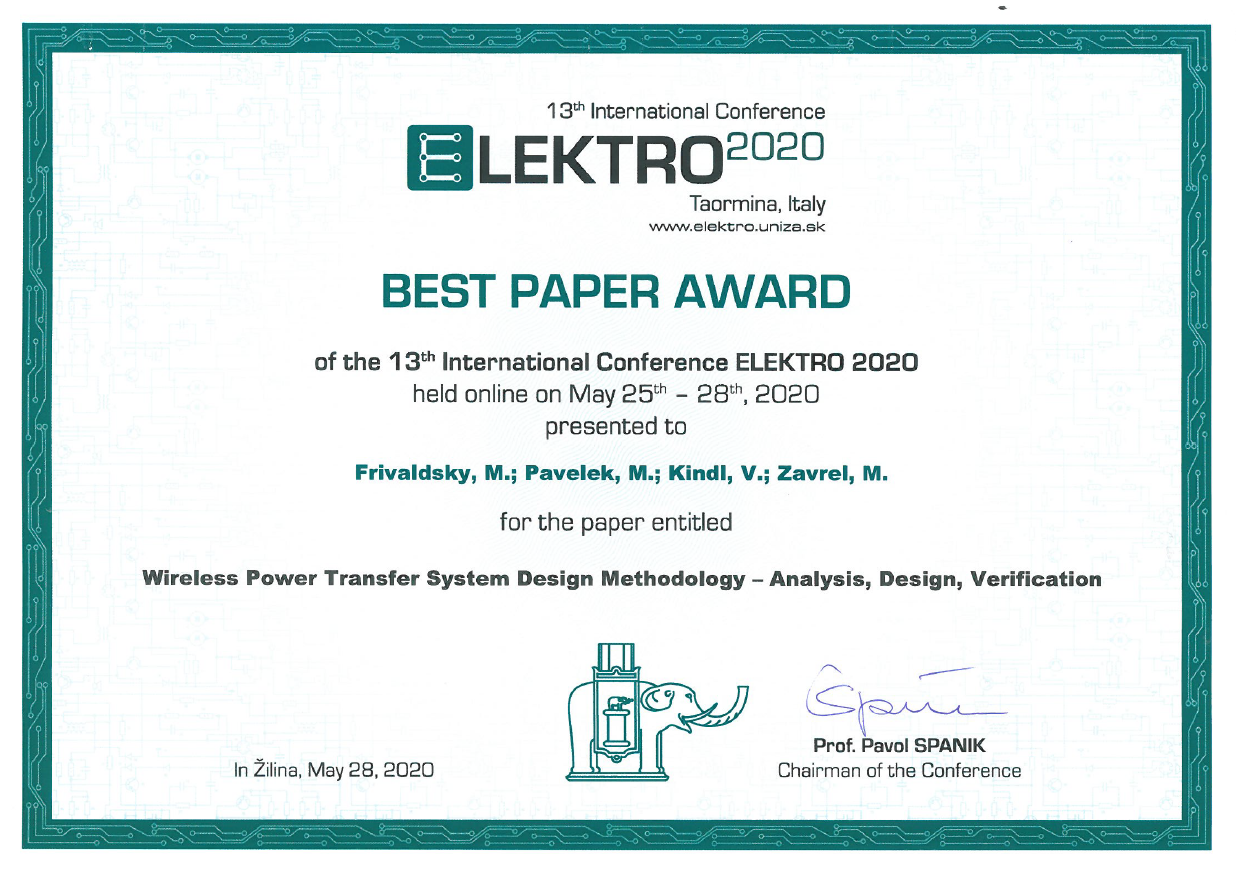 Výzkumníci Fakulty elektrotechnické Vladimír Kindl a Martin Zavřel uspěli v mezinárodní konkurenci na online konferenci ELEKTRO 2020. Spolupracovali s kolegy z Fakulty elektrotechnické a informačních technologii ze Žiliny na článku Wireless Power Transfer System Design Methodology – Analysis, Design, Verification a získali za něj ocenění Best Paper Award.