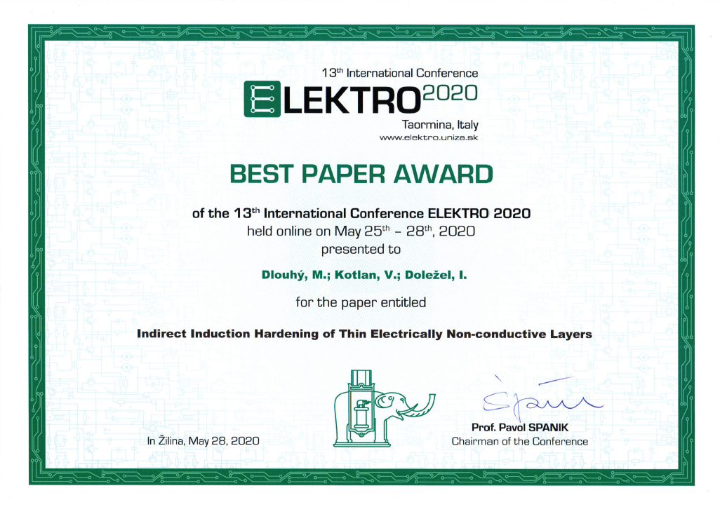 Z konference přivezli Best Paper Award i Václav Kotlan a Ivo Doležel z katedry teoretické elektrotechniky. Uspěli s tématem Indirect Induction Hardening of Thin Electrically Non-conductive Layers, když prezentovali model nepřímého indukčního ohřevu velmi tenkých vrstev vyrobených z elektricky nevodivých materiálů.