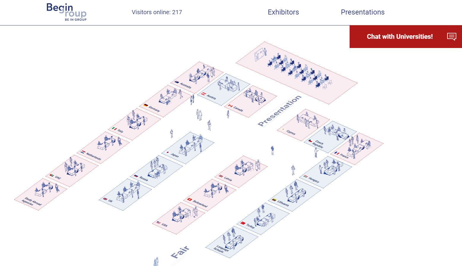 A jak účast na takovém veletrhu vypadá? Každá univerzita má na portálu akce svůj vlastní virtuální stánek, který si přizpůsobí podle svých potřeb. Návštěvníkovi se po vstupu zobrazí základní textové a obrazové informace o instituci, pomocí odkazů pak může pokračovat na webové stránky a videa nebo si stáhnout nejrůznější informační materiály. Kromě toho jsme na každém veletrhu měli k dispozici jednu či dvě videoprezentace na platformě ZOOM a vlastní chatovací místnost, kde jsme čtyři hodiny odpovídali na dotazy návštěvníků. Díky tomu, že návštěvníci při registraci uvádějí, o jaký typ a zaměření studia mají zájem, jsou přednostně směrováni na stánky s nabídkou odpovídající jejich prioritám.