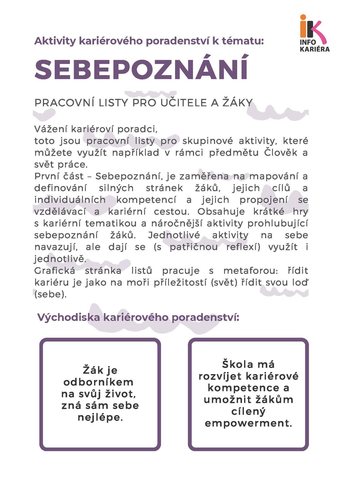 Sebepoznání, Trh práce, Sebeprezentace. To jsou názvy tří sad pracovních listů, jež mohou při výjezdech do škol používat kariéroví poradci, ale s žáky pomocí nich mohou pracovat také sami učitelé. „Cílovou skupinou projektu jsou žáci od druhého stupně základní školy až do konce střední školy, ale listy jsou určeny zejména těm z posledních ročníků,“ říká za Informační a poradenské centrum ZČU Jana Krunclová.