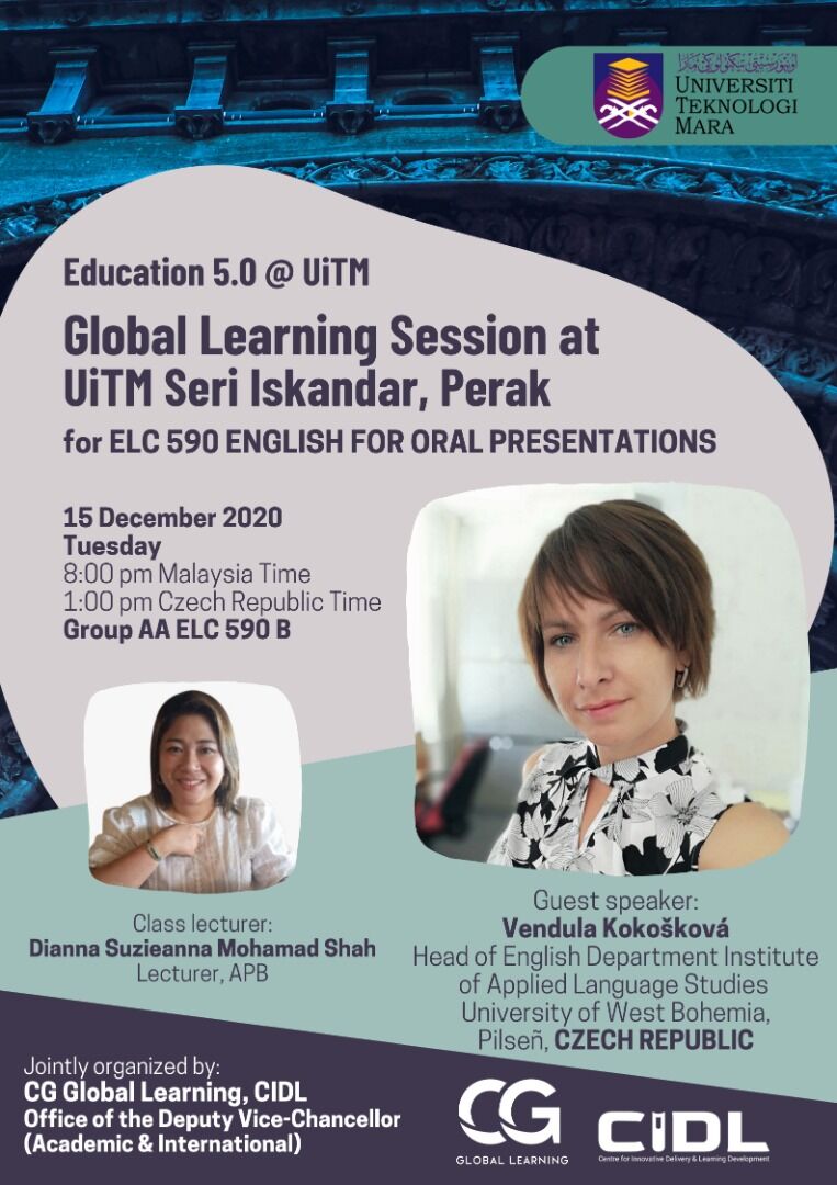 Pozvání na workshop přijala vedoucí anglického oddělení UJP Vendula Kokošková, která se v online prostředí setkala se studenty oborů chemie, elektroinženýrství a architektury z Universiti Teknologi MARA Shah Alam v Malajsii, jednoho z partnerů ZČU. Téma workshopu bylo How to deliver an effective online speech (Jak zajistit efektivní online řeč).