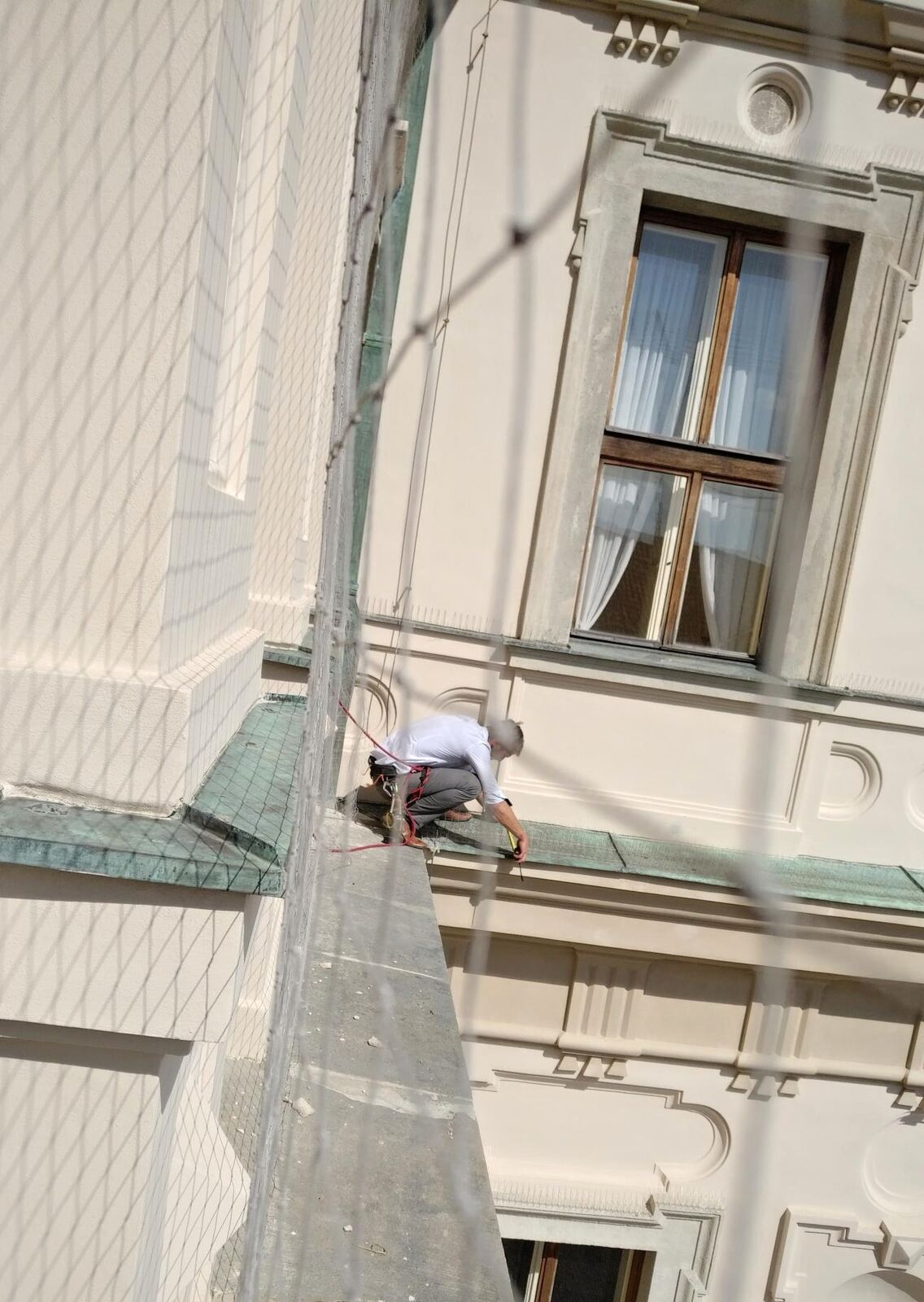 římse v prostoru mezi okny Černínského paláce asi 1,3