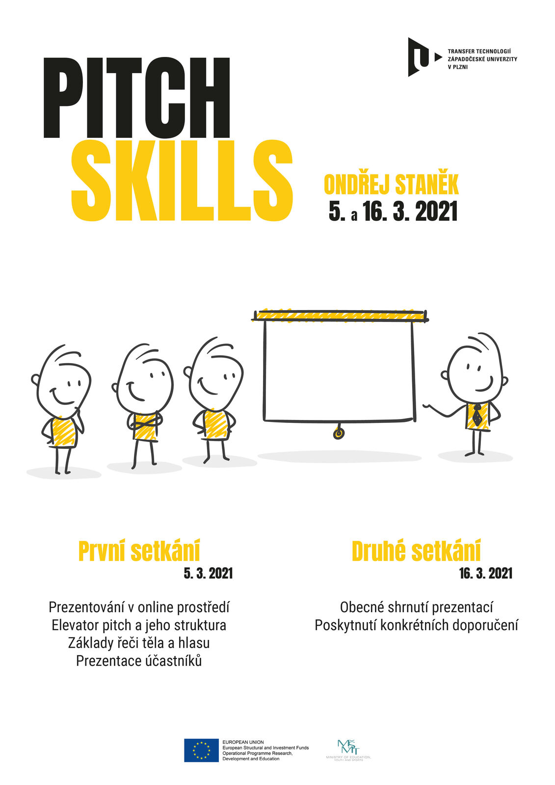 Odbor Transfer a smluvní výzkum pořádá pro zaměstnance univerzity kurzy Pitch Skills v online prostředí ve spolupráci s Ondřejem Staňkem, odborníkem na prezentační dovednosti, design a rétoriku.