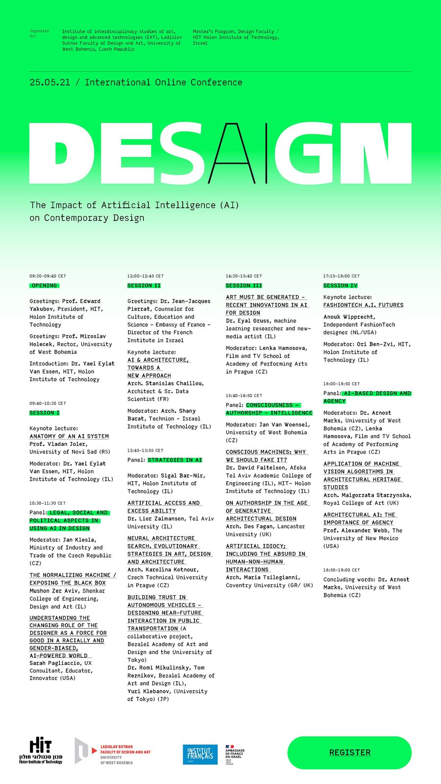 Konference nabídne příspěvky uznávaných odborníků. "Systémovému dopadu a struktuře fenoménu AI se věnuje jeden z hlavních řečníků Vladan Joler. Architekt Stanislas Chaillou je autorem excelentního příkladu použití AI v kreativní práci designéra/architekta a ukazuje na potřebu detailní profesní znalosti oboru a skvělou práci s daty a statistikou. Annouk Wipprecht systematicky experimentuje s interaktivitou, technologiemi a budoucností designu v nových pokusných dílech v oblasti fashion," dodává proděkan Marks.