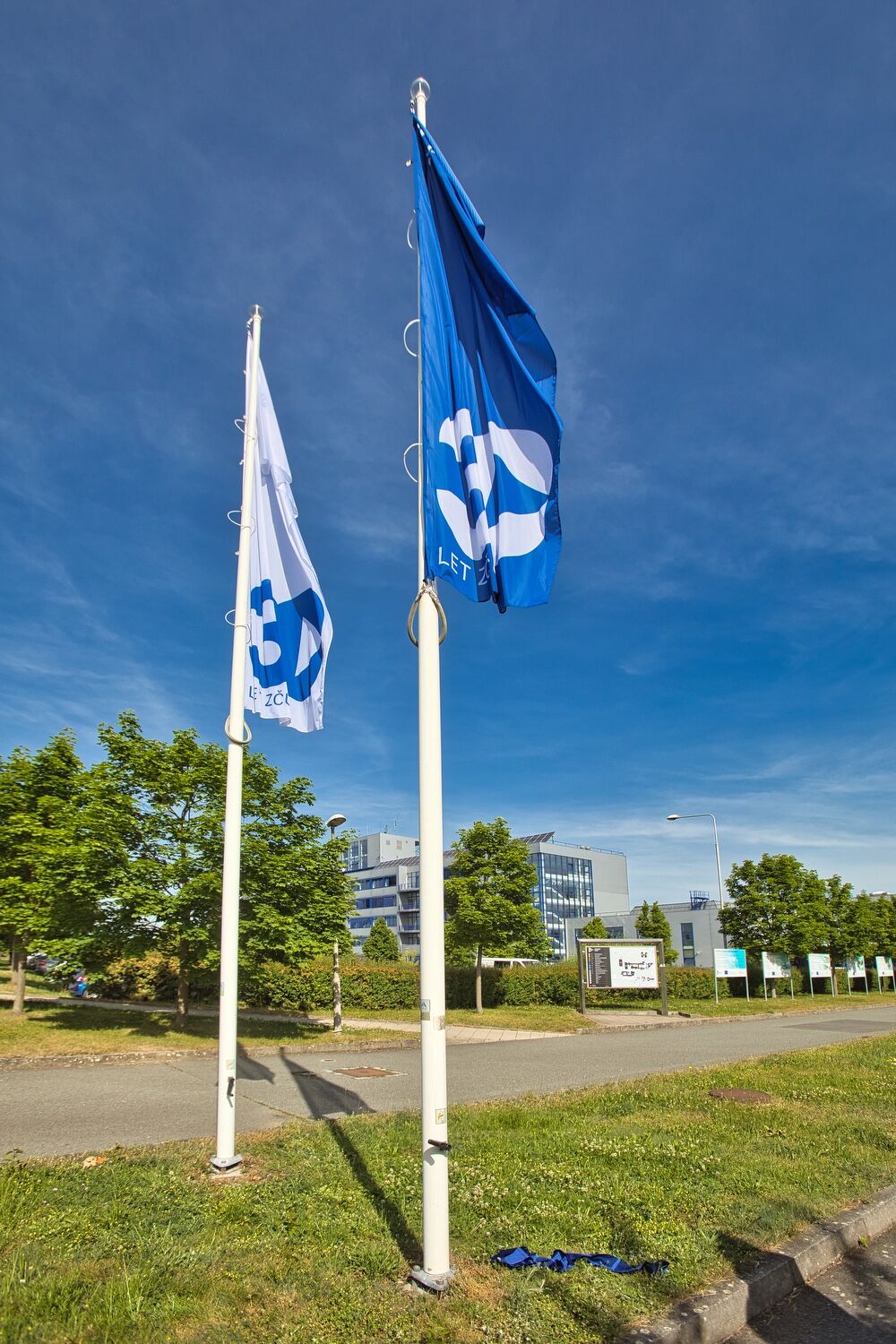 Vlajky 30 let ZČU u vchodu do kampusu.