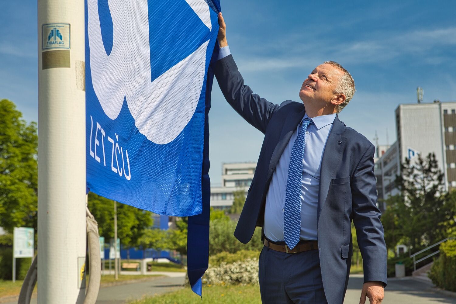 Rektor ZČU Miroslav Holeček vyvěsil vlajku k 30 letům ZČU.