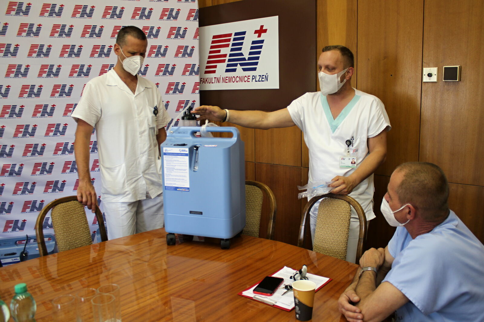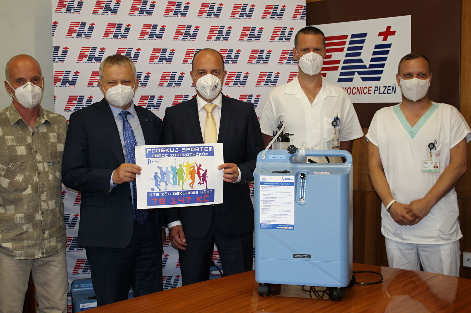 Symbolický šek na peníze, za něž nemocnice zakoupila koncentrátory kyslíku, dnes rektor Západočeské univerzity Miroslav Holeček předal řediteli FN Plzeň Václavu Šimánkovi. Za ZČU byl přítomen také vedoucí pořádající katedry tělesné výchovy a sportu Fakulty strojní ZČU Pavel Červenka. FN Plzeň zastupovala dále náměstkyně pro ošetřovatelskou péči Andrea Mašínová, primář Kliniky pneumologie a ftizeologie FN Plzeň David Havel a vrchní sestra kliniky Aleš Červinka.