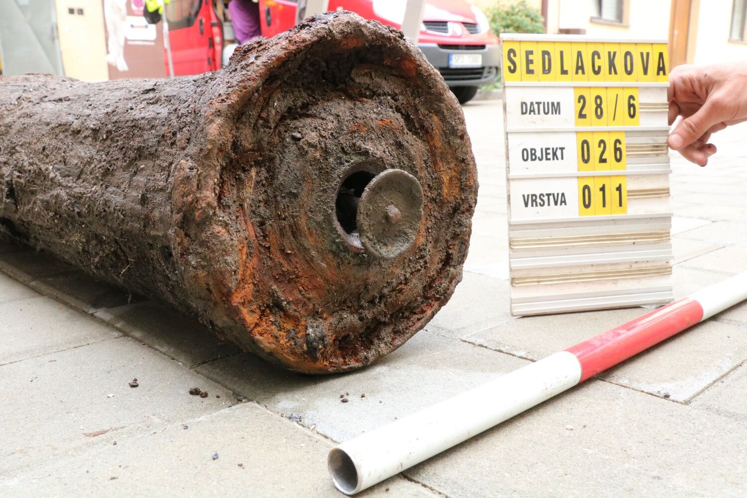 Detail sacího ventilu (součást pumpovacího systému pro jímání vody ze studny) dřevěného historického potrubí, které bylo objeveno v rámci archeologického výzkumu studny v hloubce 5 metrů.