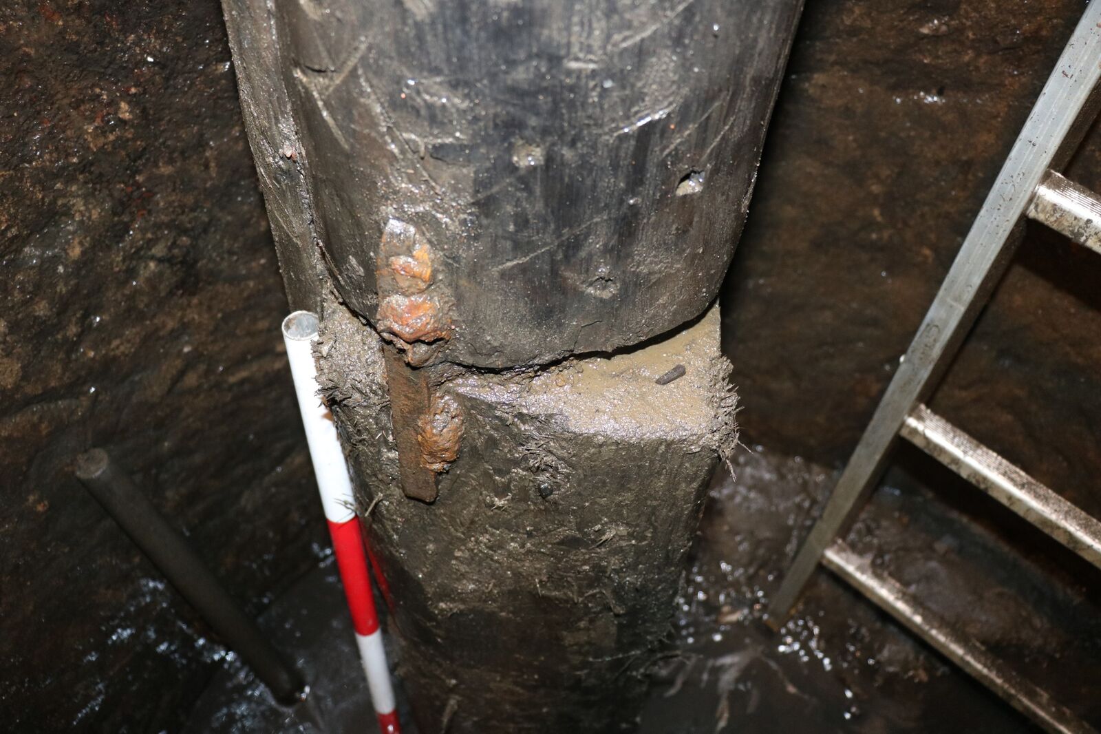 Napojení spodní části historického potrubí na dřevěnou trámovou podstavu v 15 metrech hloubky studny. Archeologickým odkryvem byly zachyceny prvky původních spojů.