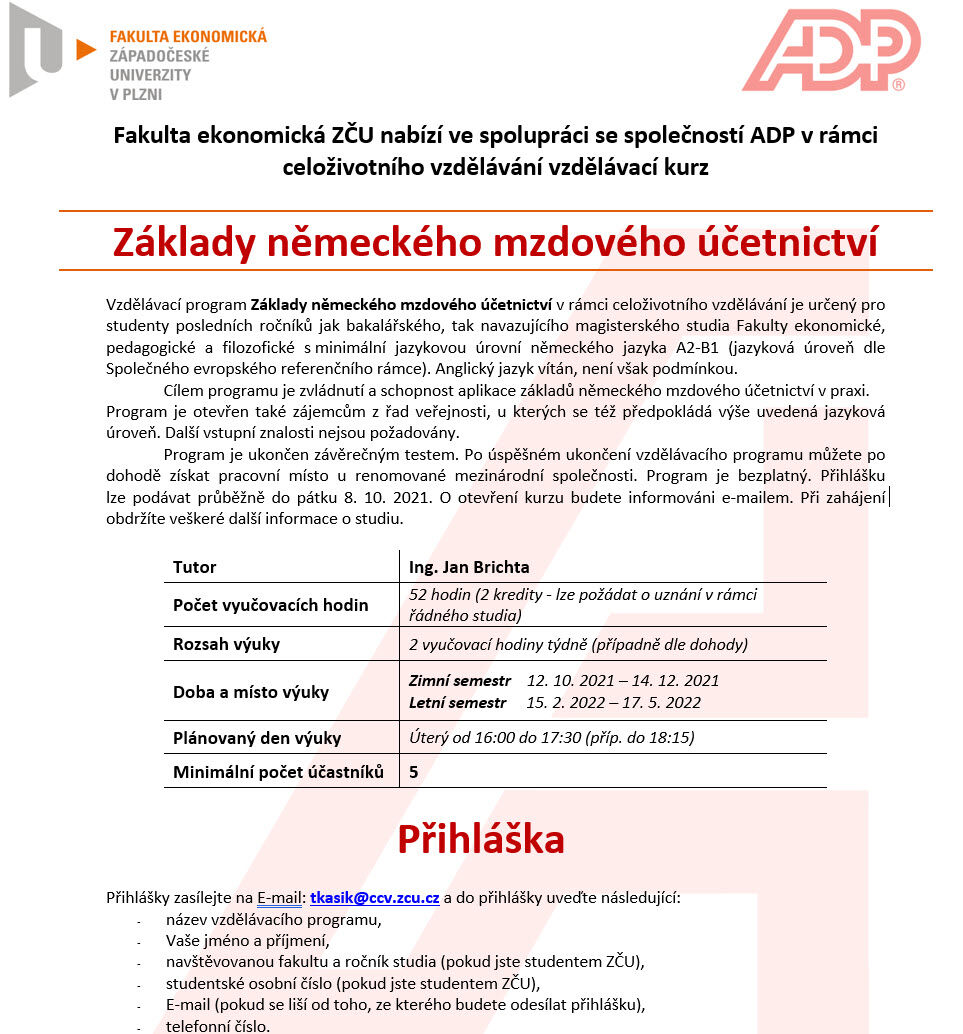 Společnost ADP a Západočeská univerzita v Plzni opět připravili v rámci celoživotního vzdělávání bezplatný vzdělávací program Základy německého mzdového účetnictví. Určen je nejen studentům ZČU, ale také zájemcům z řad veřejnosti, vhodný je i pro studenty posledních ročníků středních škol a VOŠ či jejich absolventy.