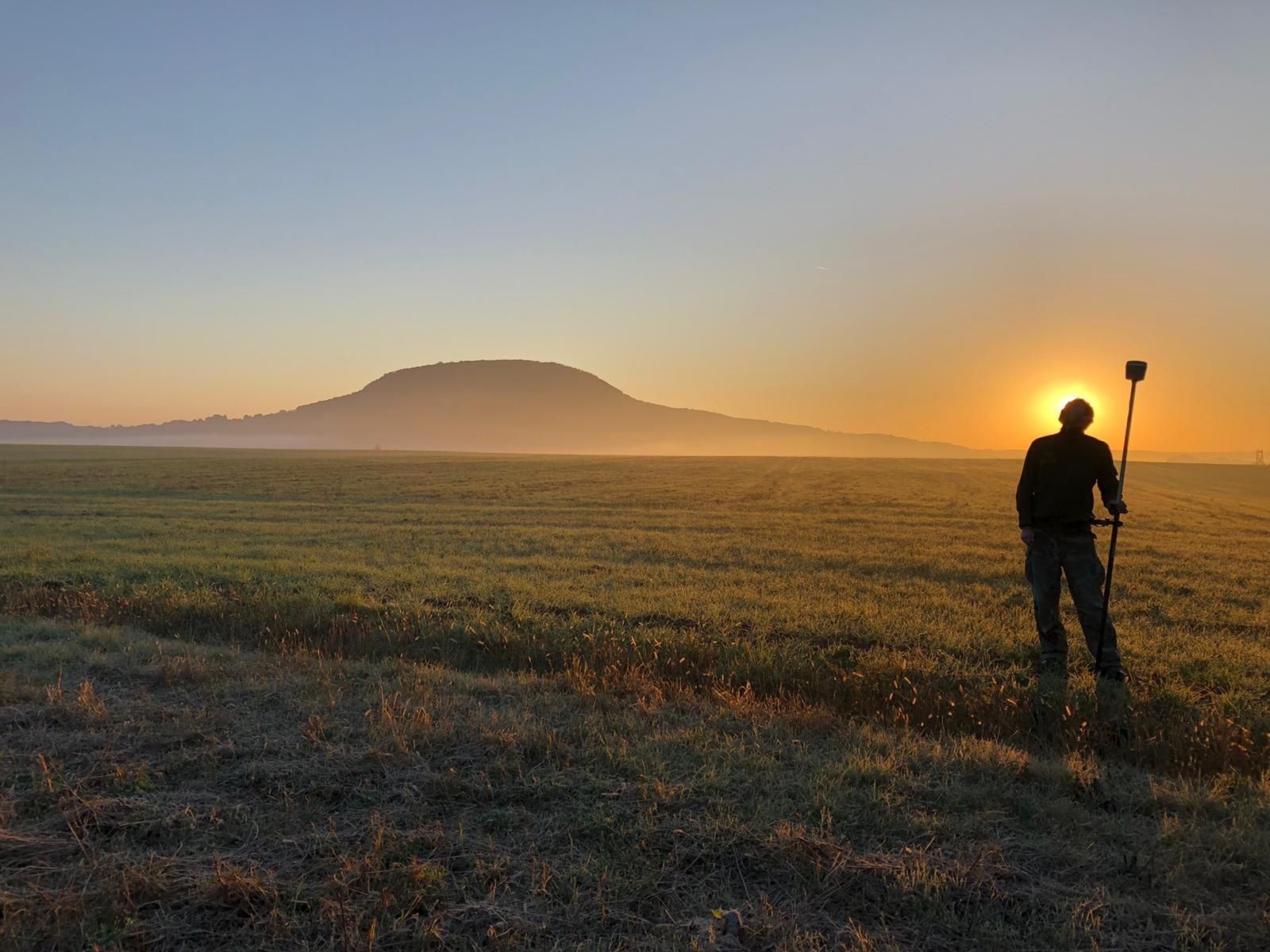 Zahájení archeologického výzkumu mohyly ve Vražkově pod horou Říp. Vedoucí výzkumu vytyčuje za úsvitu sondy v místě pohřebních rituálů pozdní doby kamenné.