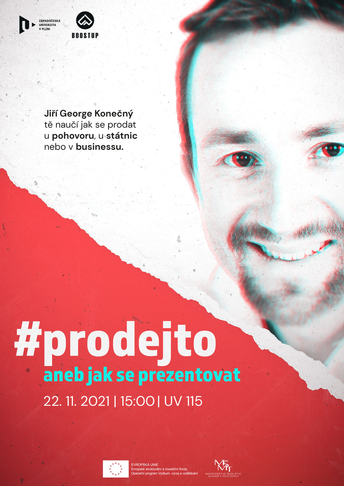 Podnikatelský studentský inovační klub BoostUp zve na workshop na téma: Prodej to! aneb Jak se prezentovat s Jiřím Georgem Konečným. Máte skvělé nápady, perfektně připravenou absolventskou práci či vás čeká jakákoliv prezentace? Přijďte se naučit kouzlo sebeprezentace!