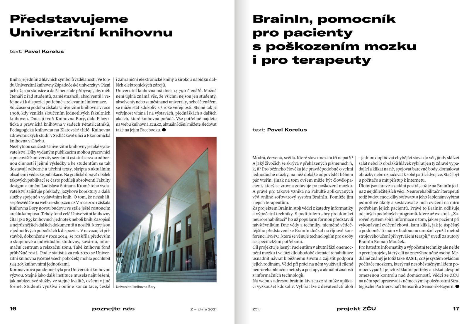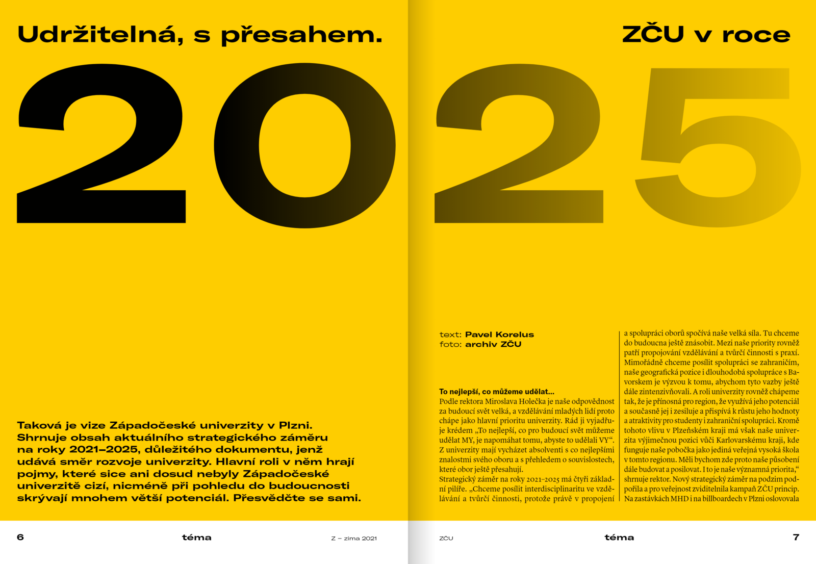 Hlavní článek nového čísla jsme věnovali aktuálnímu strategickému záměru Západočeské univerzity na roky 2021-2025 a tomu, jak se má škola podle tohoto důležitého dokumentu proměnit. Udržitelnosti, jež hraje v budoucnosti ZČU velkou roli, se týká rozhovor s Petrou Taušl Procházkovou, vedoucí Centra podnikání a udržitelnosti Fakulty ekonomické. Jak to vypadá, když věda pomáhá zachraňovat životy, vám v rubrice Osobnost ZČU představíme díky profilu Lucie Houdové z Fakulty aplikovaných věd, v rubrice Projekt ZČU poznáte softwarový systém BrainIn pro pacienty zotavující se po poškození mozku. Nechybí samozřejmě pestrá mozaika zpráv ze všech fakult a dalších součástí naší univerzity, studentský příspěvek ani umělecká tečka na konec.
