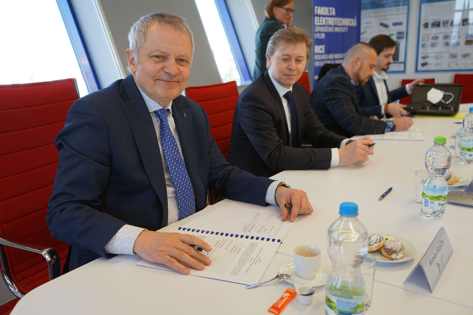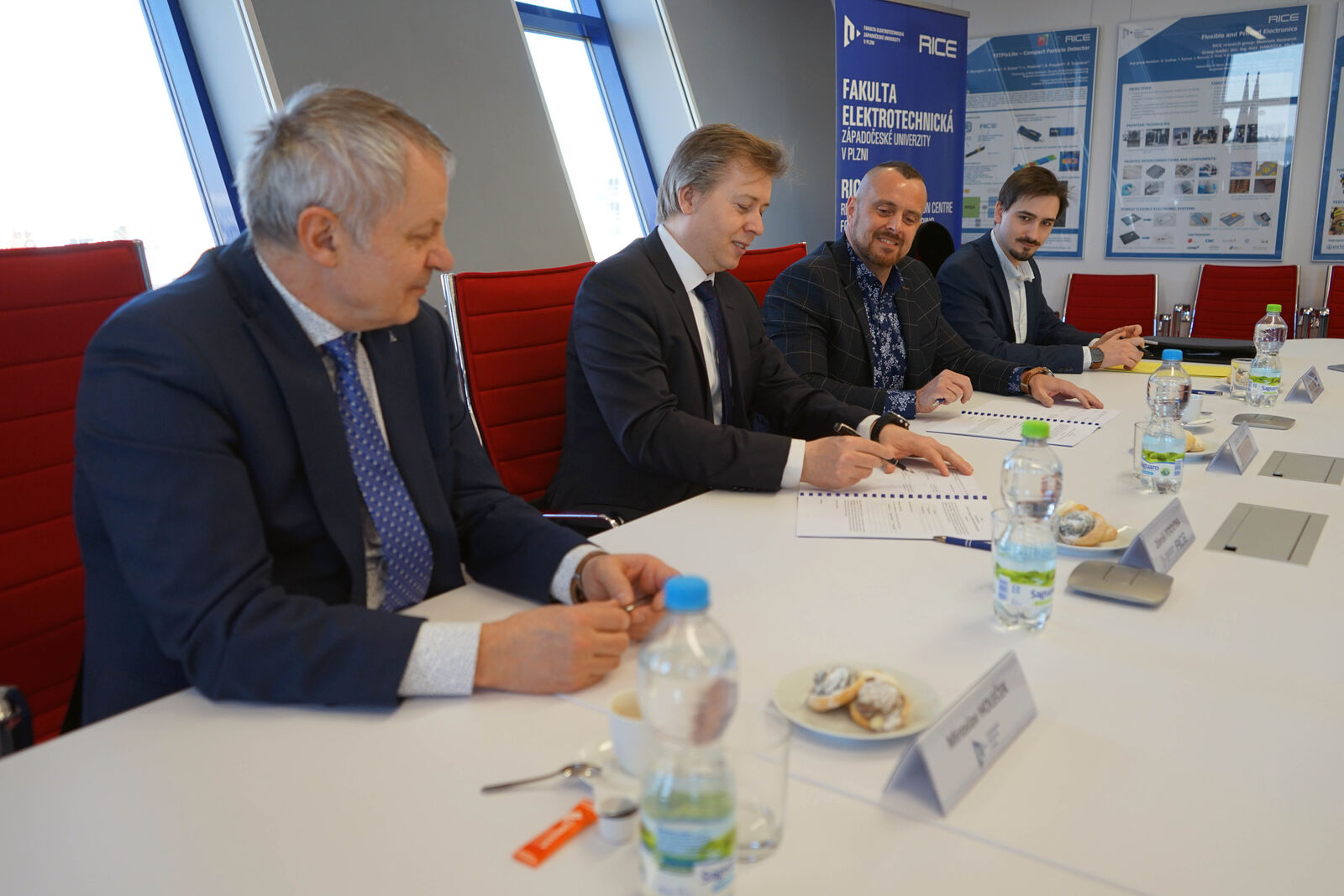 Smlouvu podepsali (zleva) rektor ZČU Miroslav Holeček, děkan FEL Zdeněk Peroutka a za společnost BRUSH SEM ředitel závodu Plzeň Dalibor Červený a Marek Nechutný.