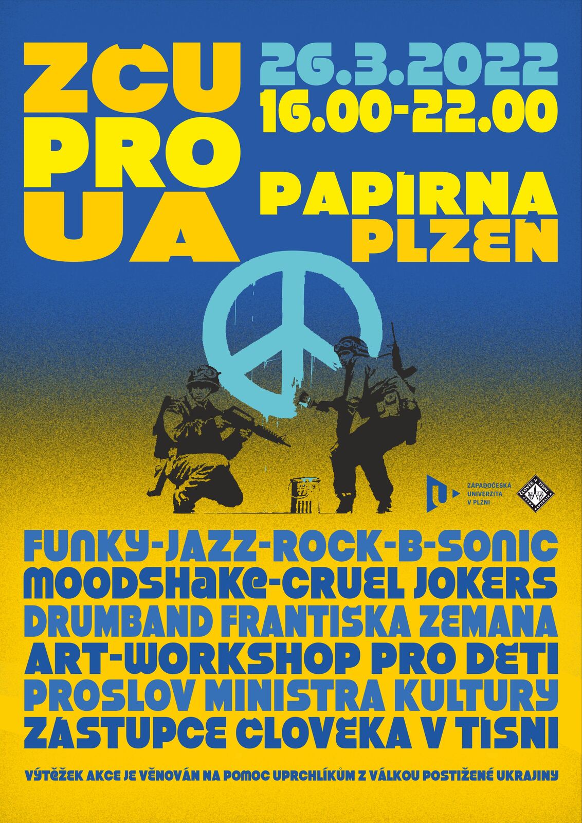 Studentská benefice začne ve čtyři odpoledne, konec je plánován až na desátou. Návštěvníci se mohou těšit na hudbu ve stylu funky, jazzu i rocku. Na pódiu se vystřídají kapely Moodshake, Cruel Jokers, Drumband Františka Zemana a vystoupí také skupina B-Sonic, speciálně zformovaná pro koncert ZČU pro Ukrajinu. V plánu jsou také krátké rozhovory s ukrajinskými studenty.