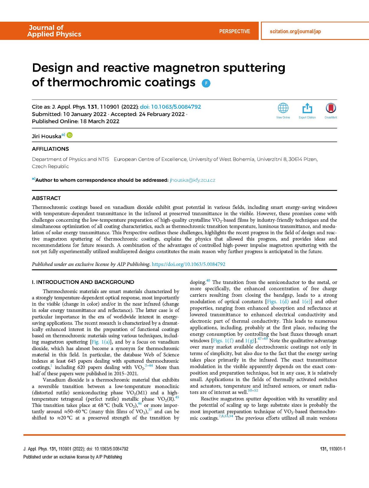 Prestižní americký časopis Journal of Applied Physics publikoval článek Jiřího Houšky z katedry fyziky Fakulty aplikovaných věd Západočeské univerzity v Plzni. Text s názvem Design and reactive magnetron sputtering of thermochromic coatings vyšel v sekci Perspectives (Výhledy).