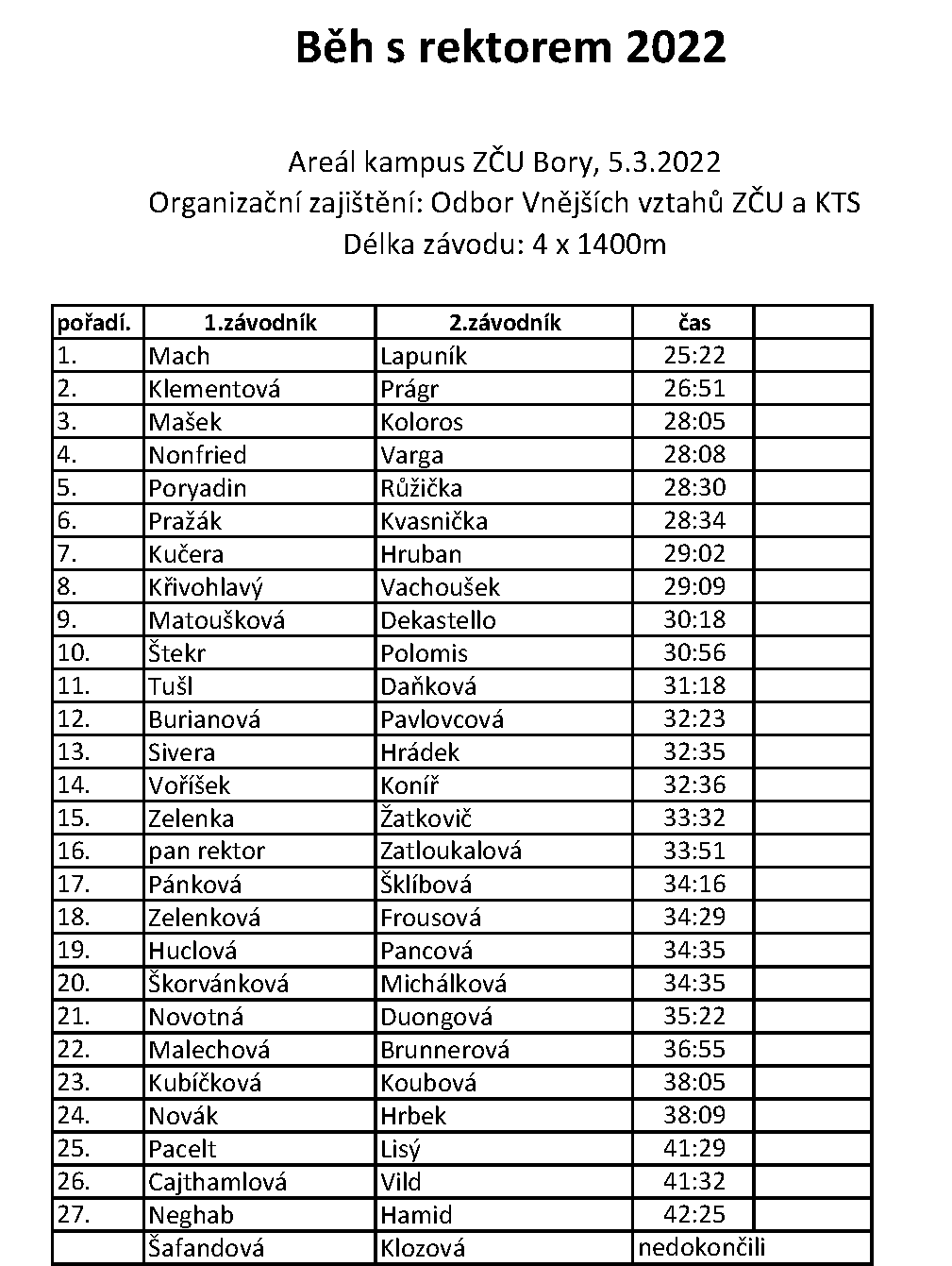 Rektor Miroslav Holeček se startovním číslem 1 tentokrát utvořil štafetovou dvojici se studentkou Fakulty ekonomické Lucií Zavadilovou, juniorskou mistryní republiky 2021 v běhu na 4x400 m. Každý z nich, stejně jako ostatní sportovci, dvakrát oběhl 1,5kilometrový okruh kolem kampusu.