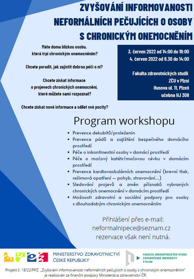 Katedra ošetřovatelství a porodní asistence FZS bude v rámci projektu č. 18/22/PPZ „Zvyšování informovanosti neformálních pečujících o osoby s chronickým onemocněním“ podpořeného Ministerstvem zdravotnictví ČR realizovat workshopy pro neformální pečující.