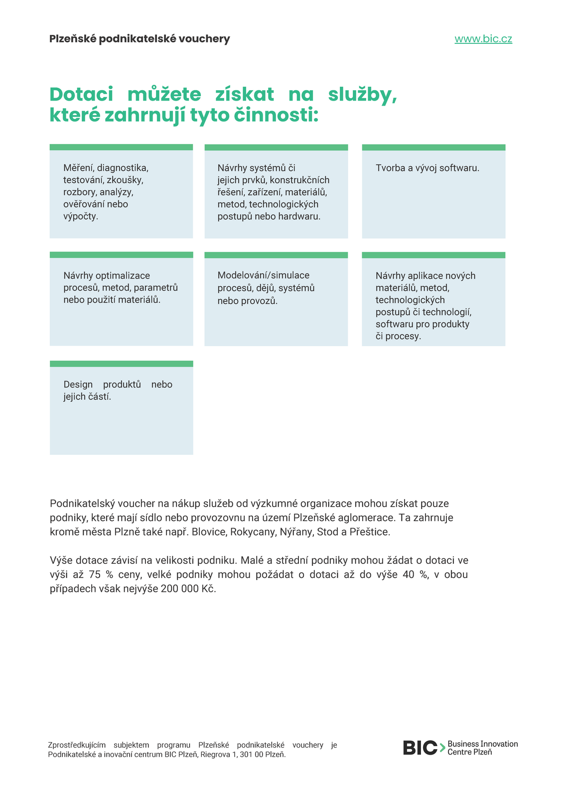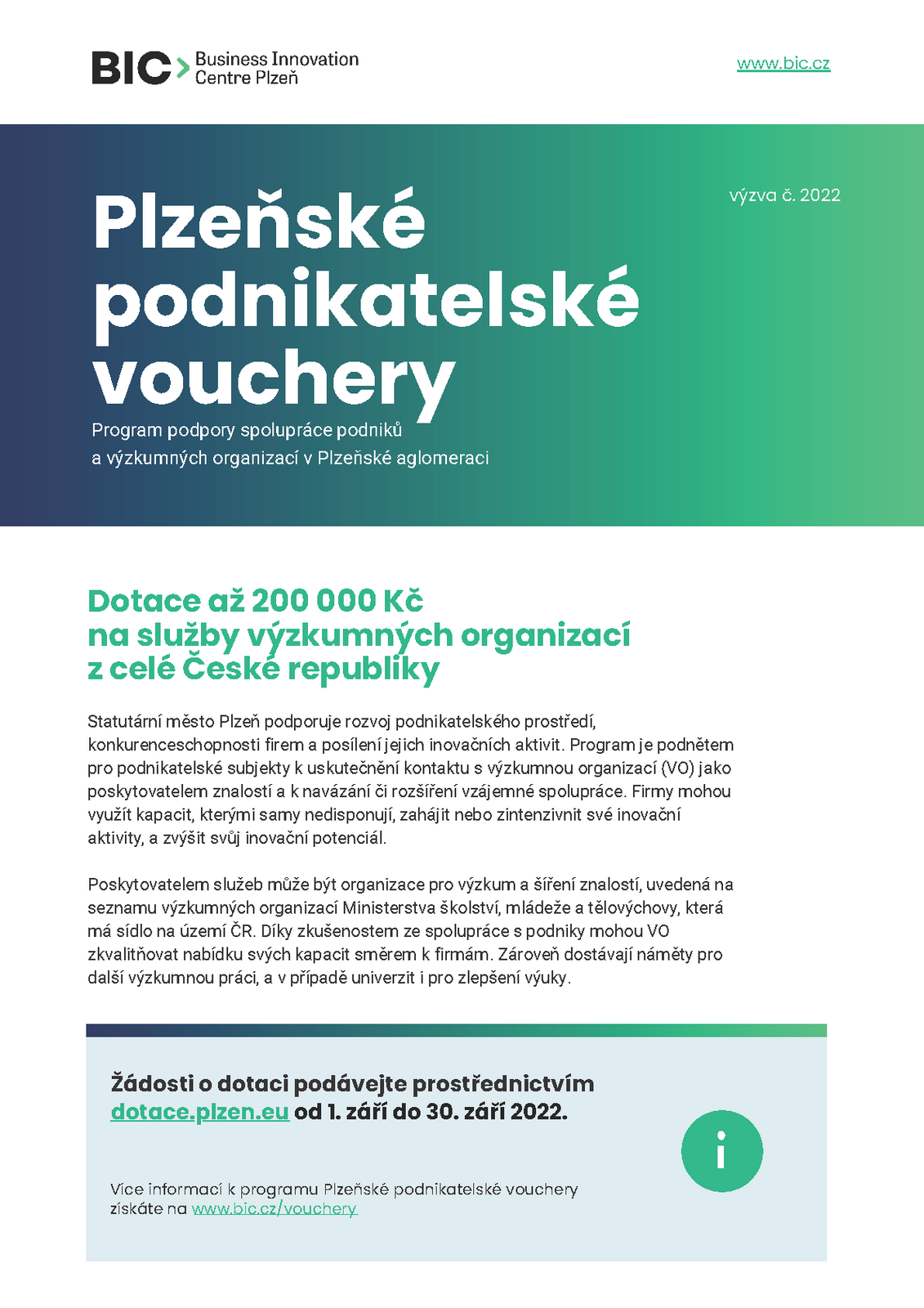 BIC neboli Business Innovation Centre Plzeň informuje o vyhlášení nové výzvy v rámci Plzeňských podnikatelských voucherů - Programu podpory spolupráce podniků a výzkumných organizací v Plzeňské aglomeraci. Program je jedním z nástrojů, kterými Statutární město Plzeň přispívá k rozvoji podnikatelského prostředí a konkurenceschopnosti firem.