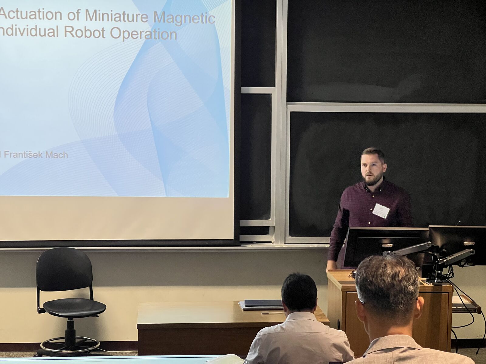 Fakultu elektrotechnickou reprezentovali doktorandi z katedry elektrotechniky a počítačového modelování. Jiří Kuthan prezentoval svůj výzkum elektromagnetického planárního polohovacího systému “Collective planar actuation of miniature magnetic robots towards individual robot operation”, Vojtěch Lapuník navázal představením své diplomové práce zabývající se digitálními materiály “Magnetically assembled electronic digital materials”, Ondřej Sodomka představil výzkum z oblasti magnetoreologických elastomerů “Magnetically controlled microfluidic channels” a Martin Vítek prezentoval diplomovou práci studenta Ondřeje Carvana zabývající se recyklací elektronického odpadu “Electronic waste separation using magnetic minirobots”.