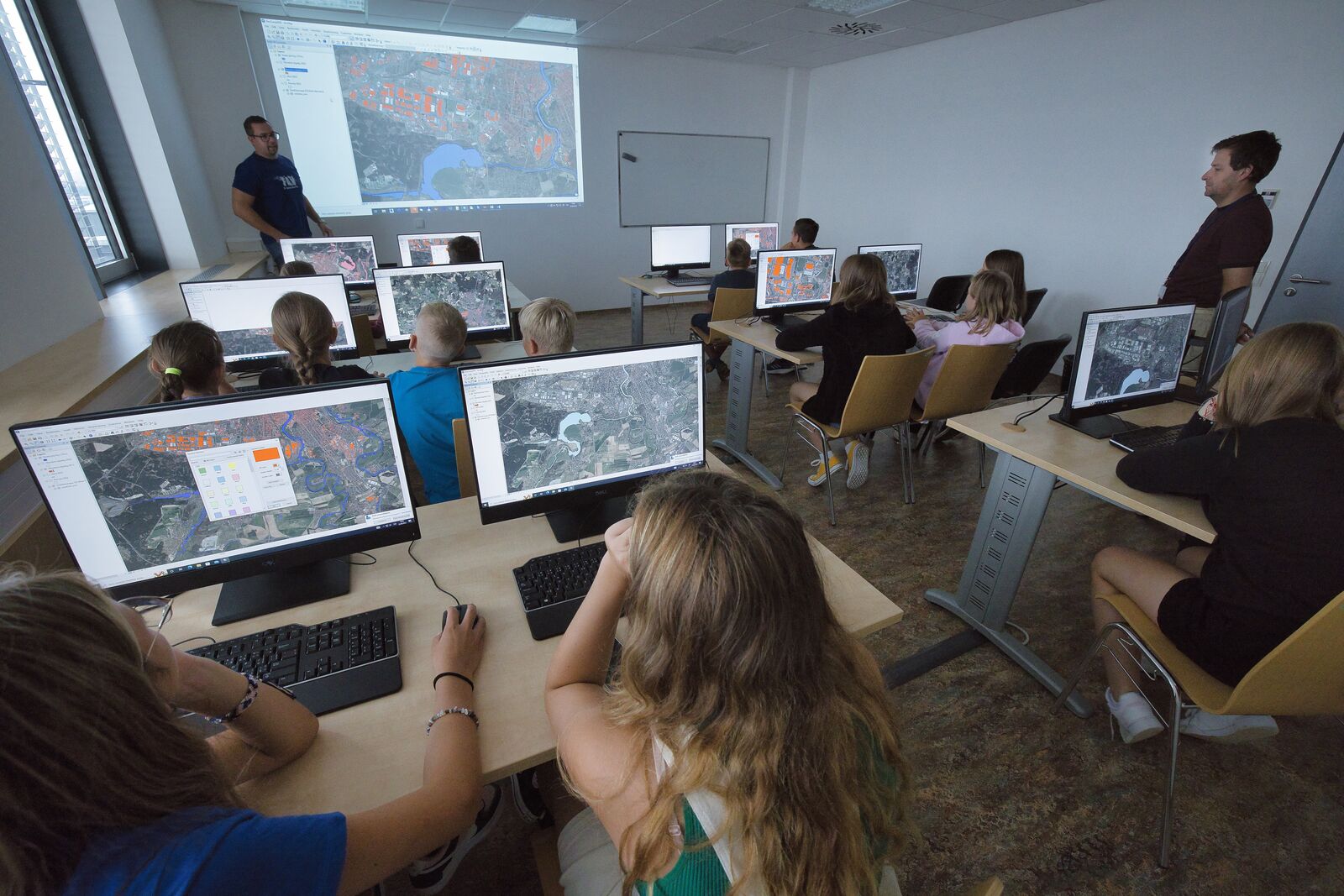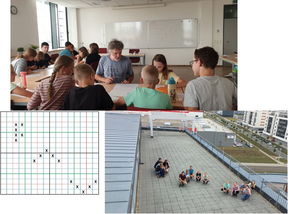 Ve dnech 22. - 24. srpna se uskutečnil 2. ročník třídenní letní školy geomatiky GeoCamp 2022. Účastníci, kterých se letos přihlásilo 16, si vyzkoušeli práci s geografickými informačními systémy (GIS) a na praktických příkladech názorně viděli, jak důležité je mít pro analýzy a rozhodování v prostoru správná a kvalitní geografická data. Vyzkoušeli si například úlohu vyhledání všech staveb v Plzni, které se nacházejí v záplavovém území, či vytvořit půdorys druhého podlaží budovy FAV v měřítku 1:100 za použití zeměměřické přístrojové techniky. Program se však neodehrával pouze v budově FAV. Děti navštívily i laboratoř IoT na Centru informatizace a výpočetní techniky, kde se seznámily s principy 3D tisku, který se hojně využívá i v geomatických projektech, například pro tisk 3D modelů historických budov v rámci ochrany kulturního dědictví. Při plnění úlohy Indexování účastníků letní školy GeoCamp se děti podívaly i na střechu budovy, kde měli podle zadaného čtyřstromu za úkol postavit se do prostoru na odpovídající dlaždici. Všichni správně našli své místo a vytvořili tak společně nápis FAV.