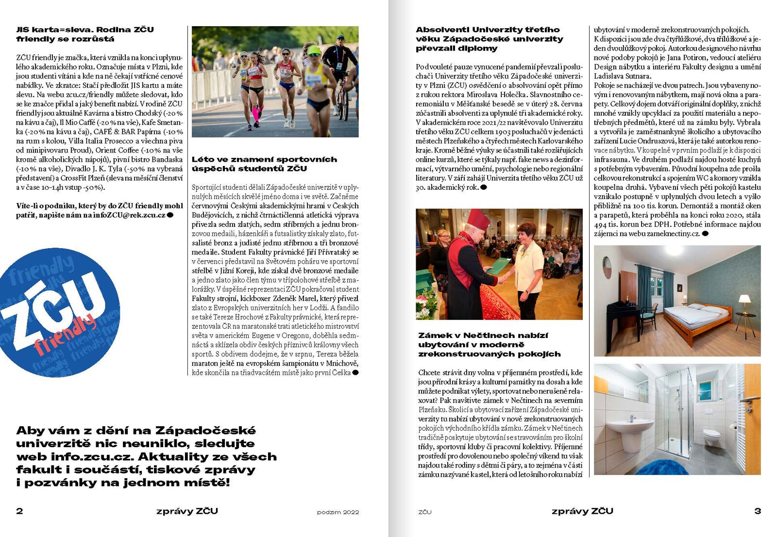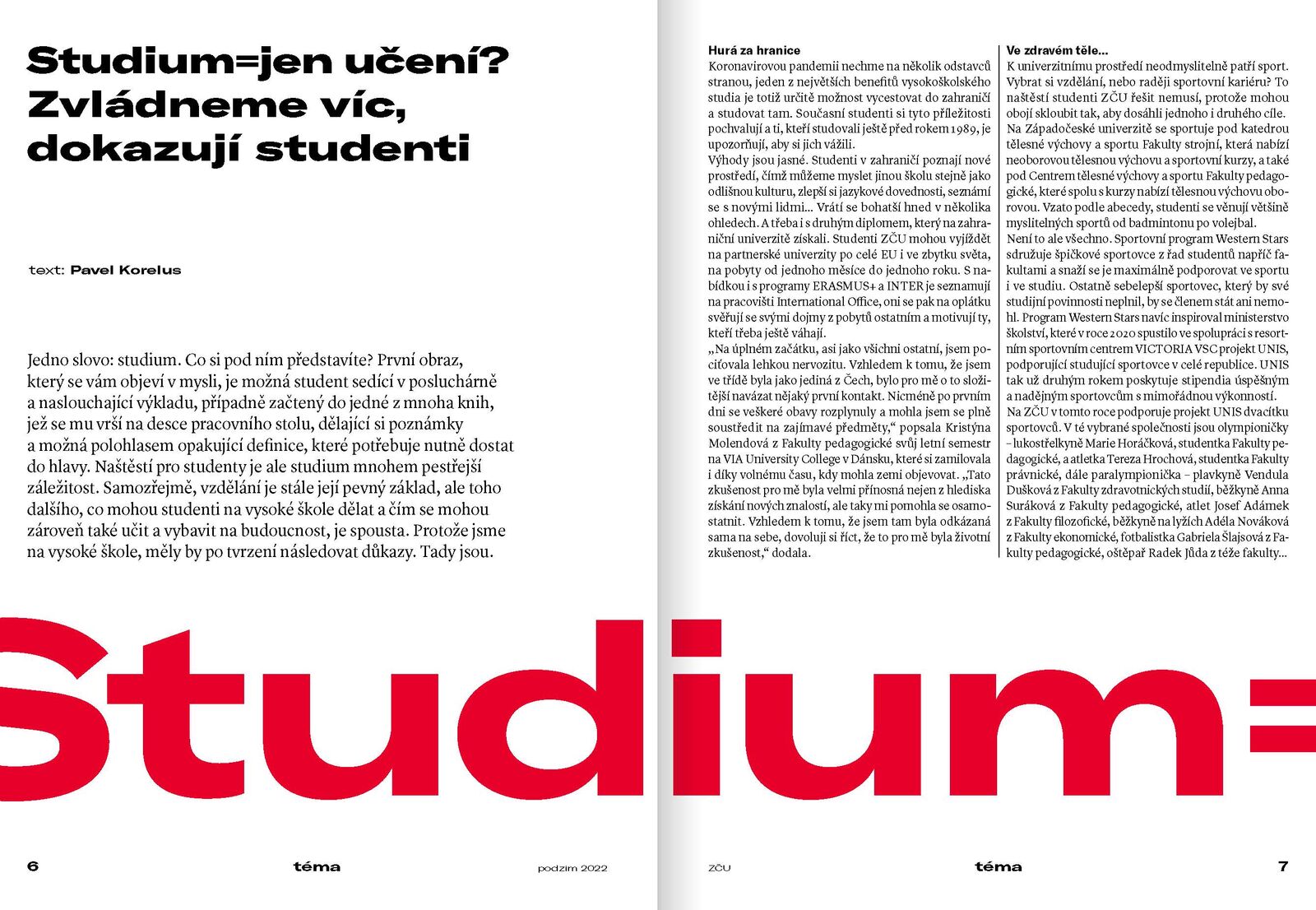 Do jeho obsahu se to promítá hned několikrát, neboť časopis nejen že shrnuje tři letní měsíce, které univerzita strávila ve zdánlivém prázdninovém klidu, ale zároveň se tentokrát obrací především ke studentům prvních ročníků, které u nás v těchto dnech vítáme. Časopis je pro ně ideální možností, jak se s univerzitou seznámit. Mohou nahlédnout do akademického dění, inspirovat se počiny stávajících studentů i zaměstnanců, v hlavním článku se dozvědět, že studium neznamená zdaleka jen učení, a v rozhovoru s Janou Krunclovou z Informačního a poradenského centra zase nabýt jistoty, že budou-li při studiu potřebovat oporu, na ZČU se jim jí dostane.
