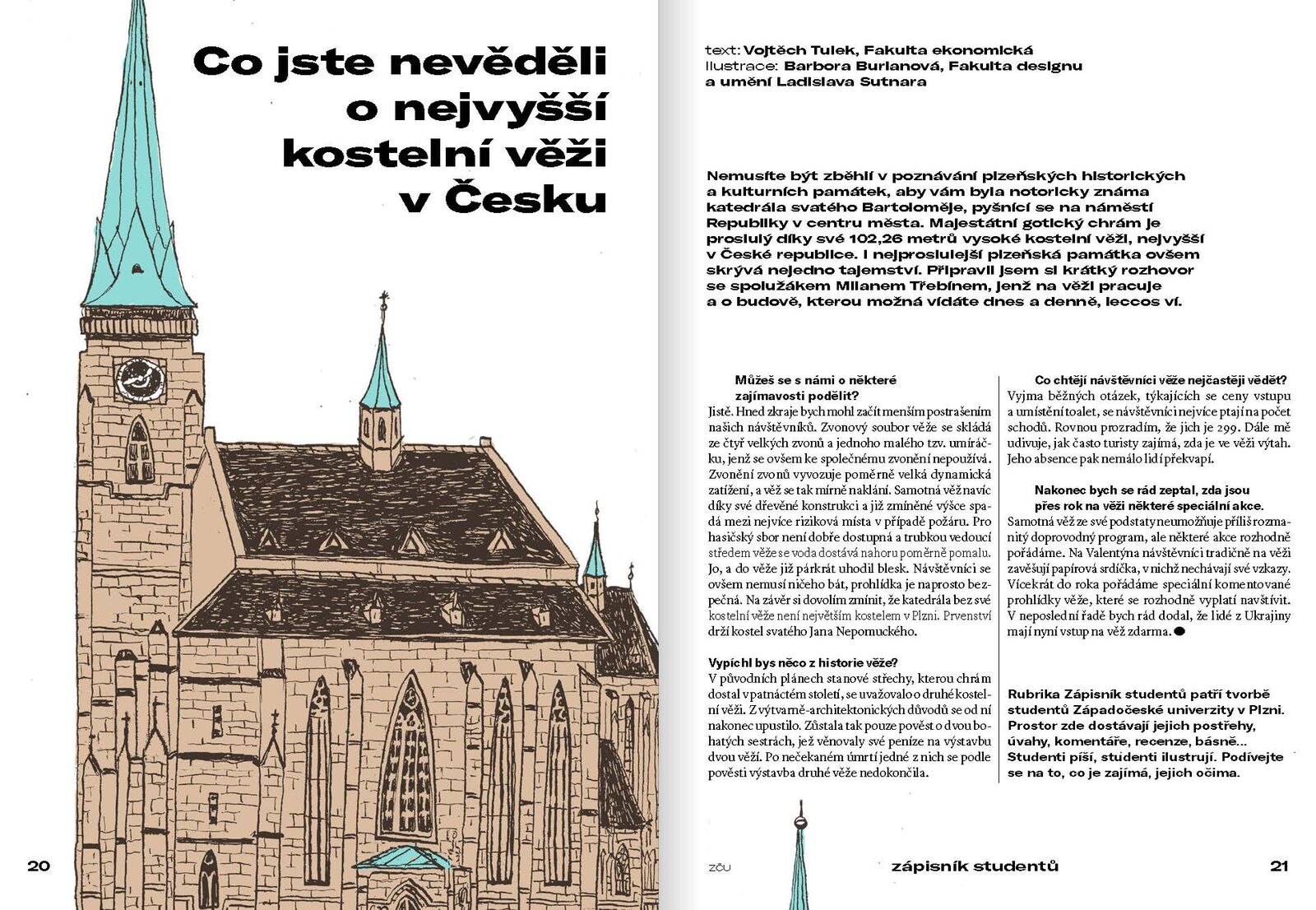 Nechybí samozřejmě studentská rubrika, jejíž redakce tentokrát zve na výstup na plzeňskou věž i na závodní okruh studentské formule, samozřejmostí je také strana věnovaná pozvánkám na akce, kterých je začátkem akademického roku tradičně mnoho.