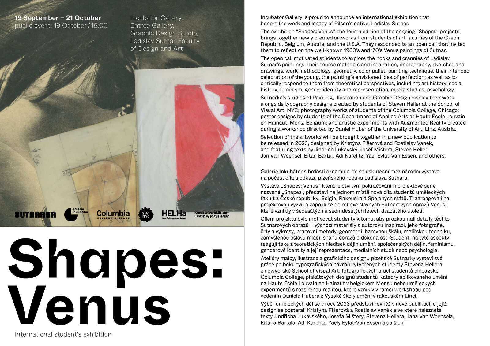 Výstava Shapes: Venus, která je čtvrtým pokračováním projektové série nazvané Shapes, představí díla studentů uměleckých fakult z České republiky, Belgie, Rakouska a Spojených států. Plakáty, malby, ilustrace a fotografie najdete v Galerii Inkubátor v přízemí budovy, v ateliéru grafických designů a v tzv. Galerii Entrée v prvním patře budovy.