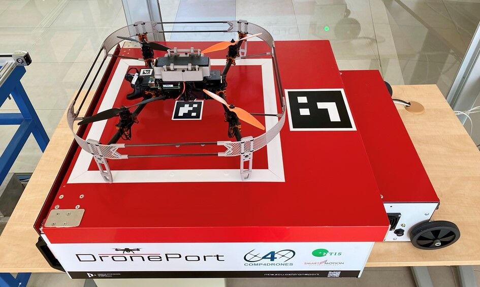 Droneport je přistávací platforma vybavená robotickým manipulátorem vlastní konstrukce a umožňuje automatickou výměnu baterie dronu. Pro lokalizaci dronu využívá Droneport data z kamery, obsahuje čtyři nabíjecí pozice a dvě odkládací, tudíž systém podporuje až šest baterií. Dobu provozu dronu ve vzduchu tak lze jednoduše navýšit. Systém se pomocí integrovaného nabíječe stará i o správné nabíjení jednotlivých baterií. Droneport je určený pro drony s komunikačním rozhraním MAVLink.