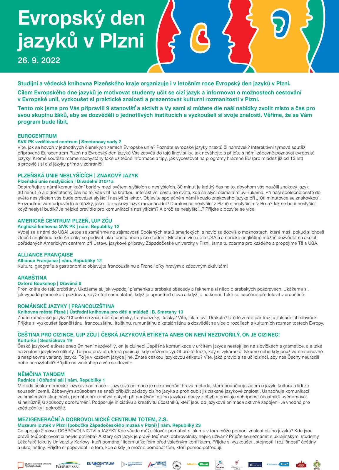 Cílem Evropského dne jazyků je motivovat studenty učit se cizí jazyk, informovat je o možnostech cestování v Evropské unii, vyzkoušet si praktické znalosti a prezentovat kulturní rozmanitosti v Plzni. I letos byla připravena celá řada stanovišť a aktivit a dle jejich nabídky bylo možno zvolit místo a čas pro registrovanou skupinu žáků, aby se dozvěděli o jednotlivých institucích a vyzkoušeli si svoje znalosti.