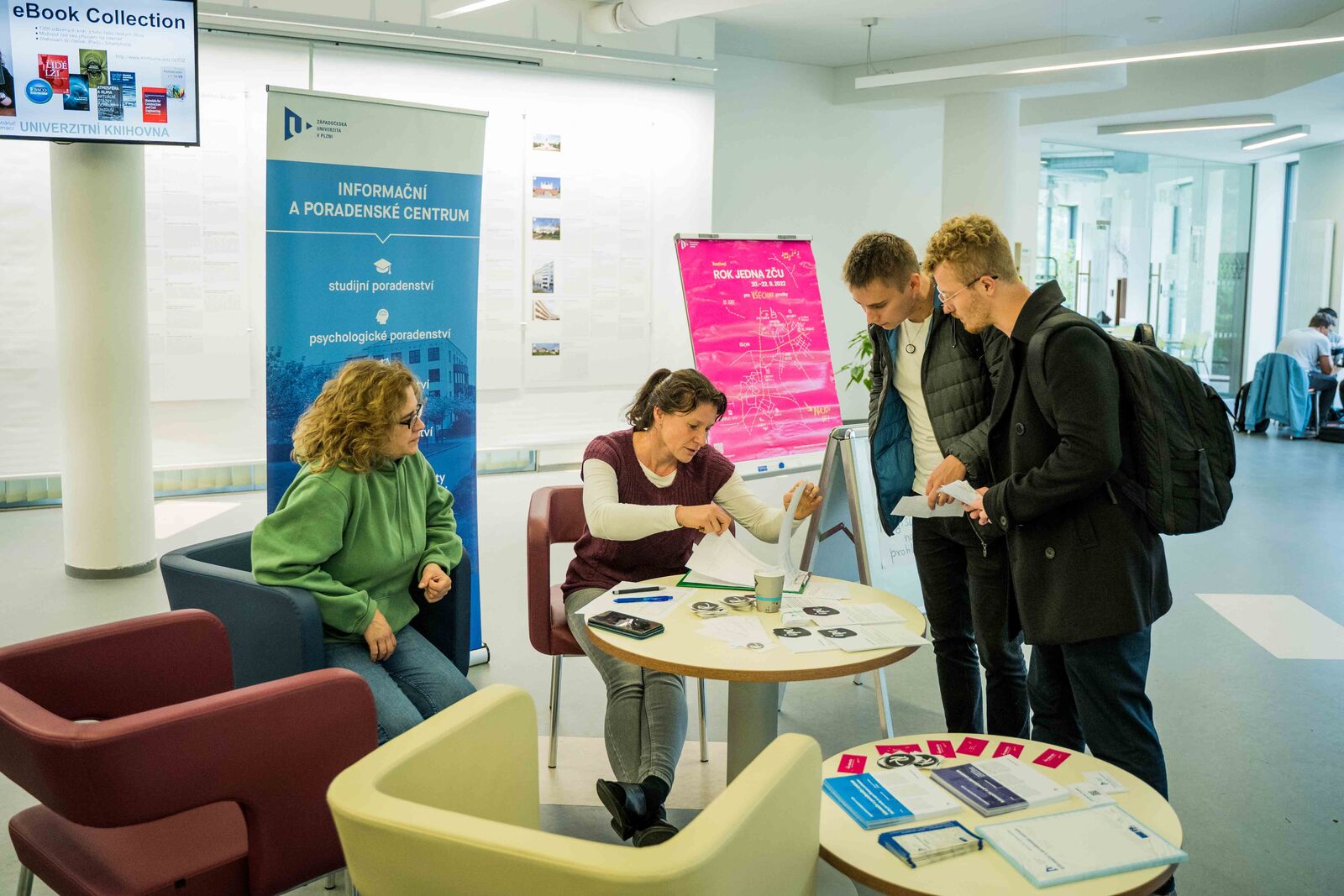 Suchá varianta Roku jedna se mezitím odehrávala v Univerzitní knihovně, kam se před deštěm schovala univerzitní pracoviště a některé studentské organizace. Prváci se tak mohli osobně seznámit s vybranými studijními referentkami a poznat také, jaké studentské spolky ZČU zaštiťuje. Představil se například spolek studentů práv ELSA, organizace IAESTE či AEGEE. Studenti objevili také univerzitní merch v tónech modré, šedé a bílé a v případě Fakulty pedagogické také zelené barvy. V knihovně se uskutečnily rovněž rovnou dva workshopy přípravy sushi a u stánku IPC se vydávaly kartičky pro Tutu soutěž, v níž po návštěvě vybraných stanovišť, mohli účastníci vyhrát zajímavé ceny věnované partnery festivalu.