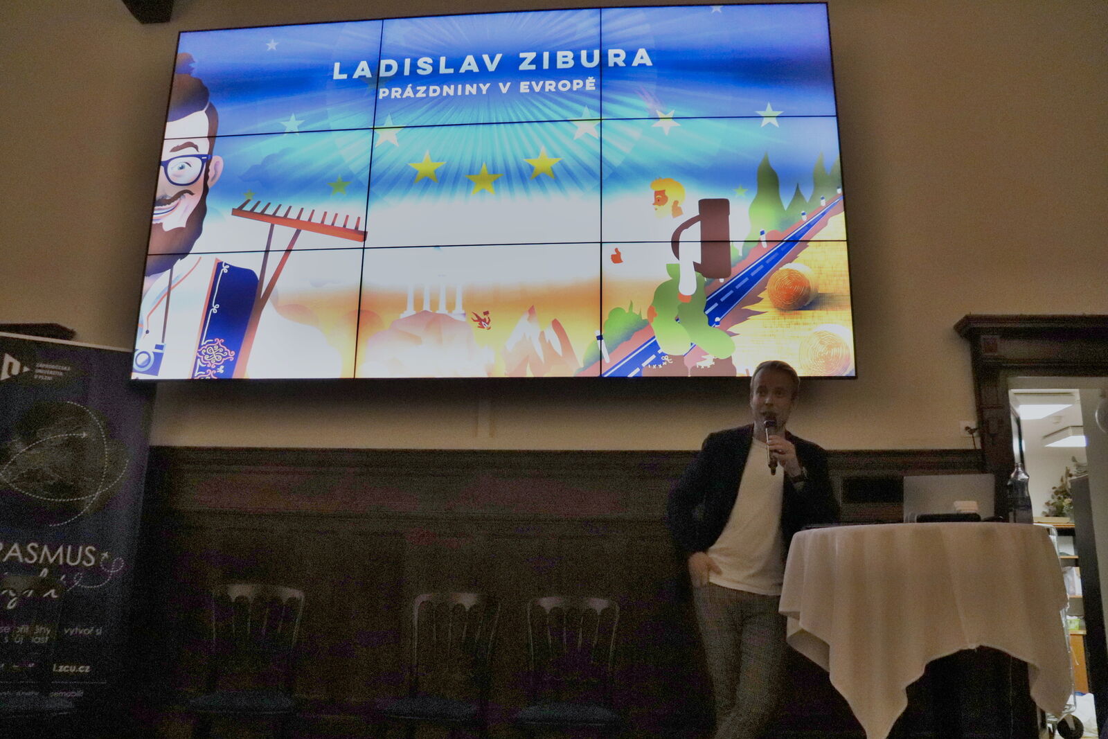 Ladislav Zibura, hlavní host večera, během druhé poloviny Erasmus Night vystoupil s poutavou přednáškou Prázdniny v Evropě. Po skončení programu bylo možné si zakoupit jeho knížky se slevou a nechat si je od autora podepsat.