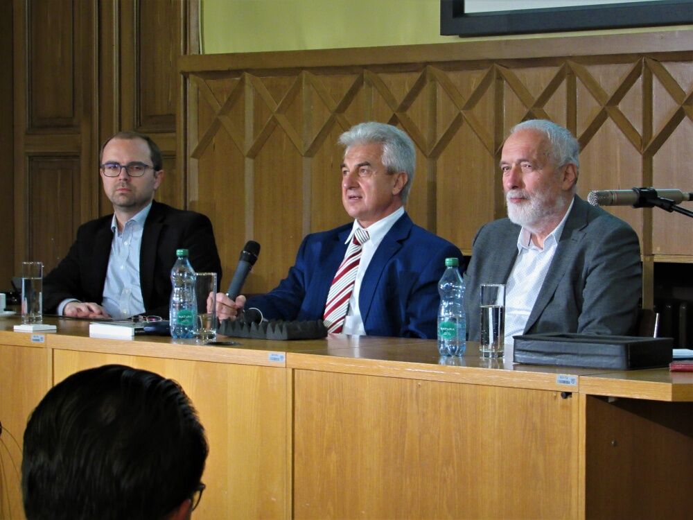V druhém diskusním panelu vystoupili (zleva) Historik Lukáš Novotný z Fakulty filozofické, ekonom Karel Zeman z VŠE a děkan Fakulty právnické Stanislav Balík .
