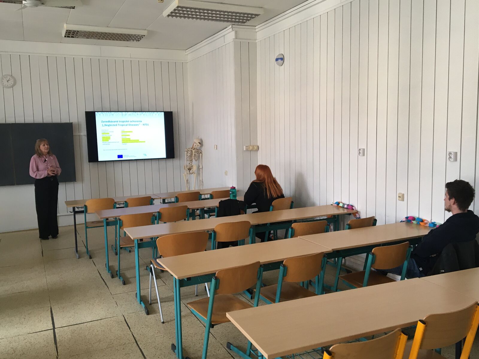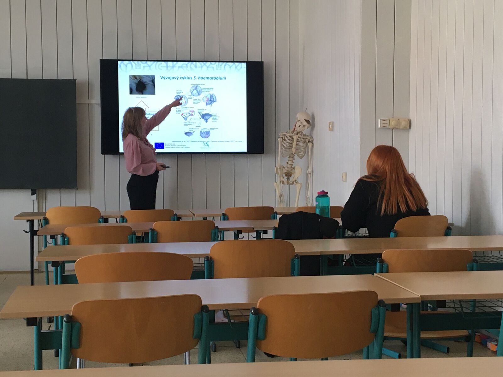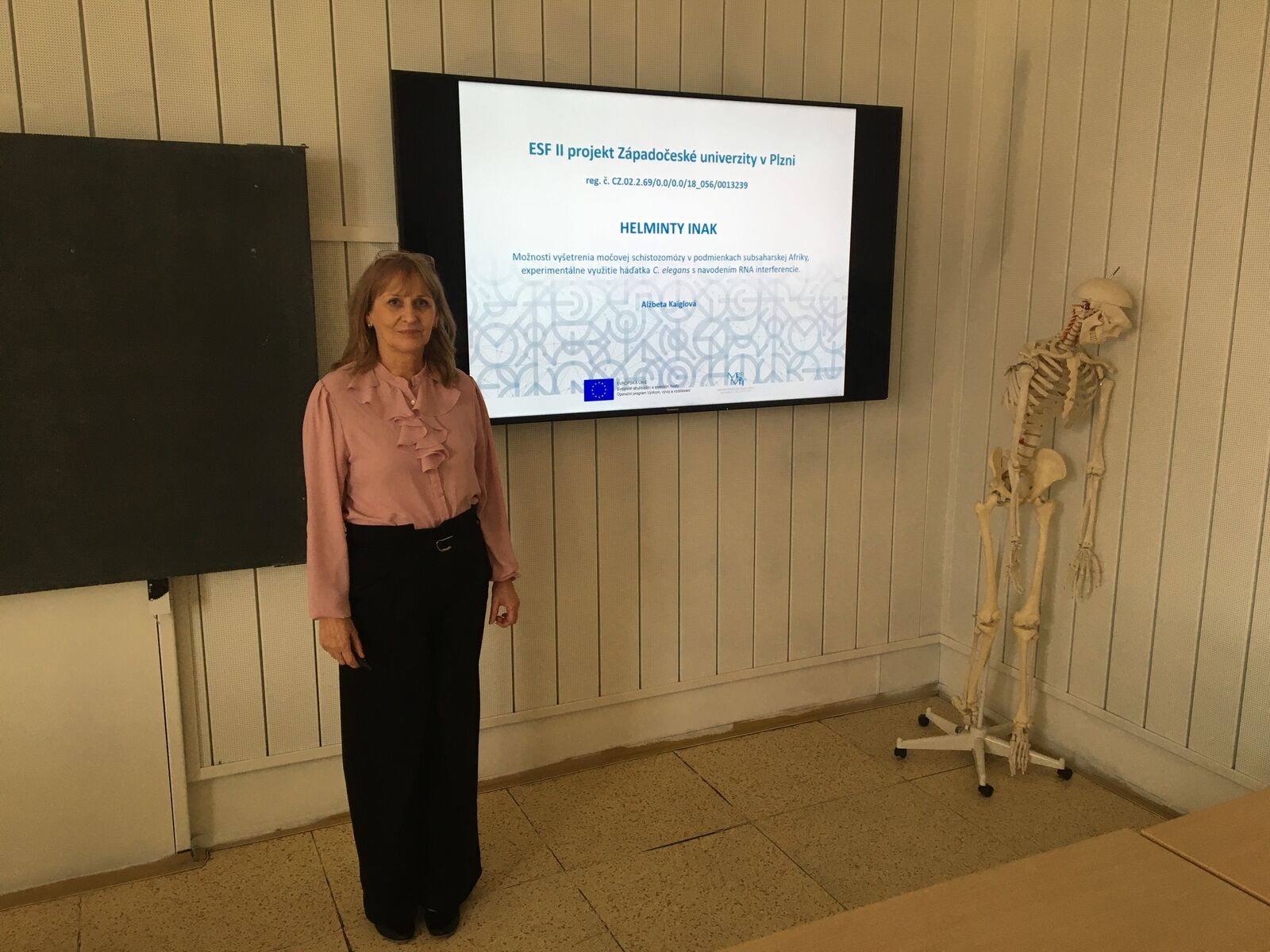 Ve čtvrtek 10. listopadu se uskutečnila přednáška odborné asistentky Alžbety Kaiglové z partnerské Trnavské univerzity v Trnavě, která působí na Katedře laboratorních vyšetřovacích metod ve zdravotnictví. Přednáška Helminti jinak - Možnosti vyšetřování močové schistosomózy v podmínkách subsaharské Afriky, experimentální využití hlístice C. elegans s indukcí RNA interference byla určena studujícím z 2. a 3. ročníku studijního programu Laboratorní diagnostika ve zdravotnictví. Alžběta Kaiglová při ní seznámila studenty a studentky s pojmem helmint neboli cizopasný červ, jenž způsobuje schistosomózu, nejvýznamnější infekční onemocnění lidí helmintického původu. Právě léčbu schistosomózy, vedoucí ke karcinomu močového měchýře, potřebuje více než 90 procent obyvatel subsaharské Afriky. Přednášející také představila projekt v Keni ve spolupráci s Trnavskou univerzitou, který probíhal ve zdravotnických centrech prvního kontaktu na pobřeží Indického oceánu, s cílem zjistit míru onemocnění u 451 dobrovolníků, zmapovat zamoření vodních zdrojů a vyhodnotit vliv používané preventivní strategie na výskyt schistosomózy.