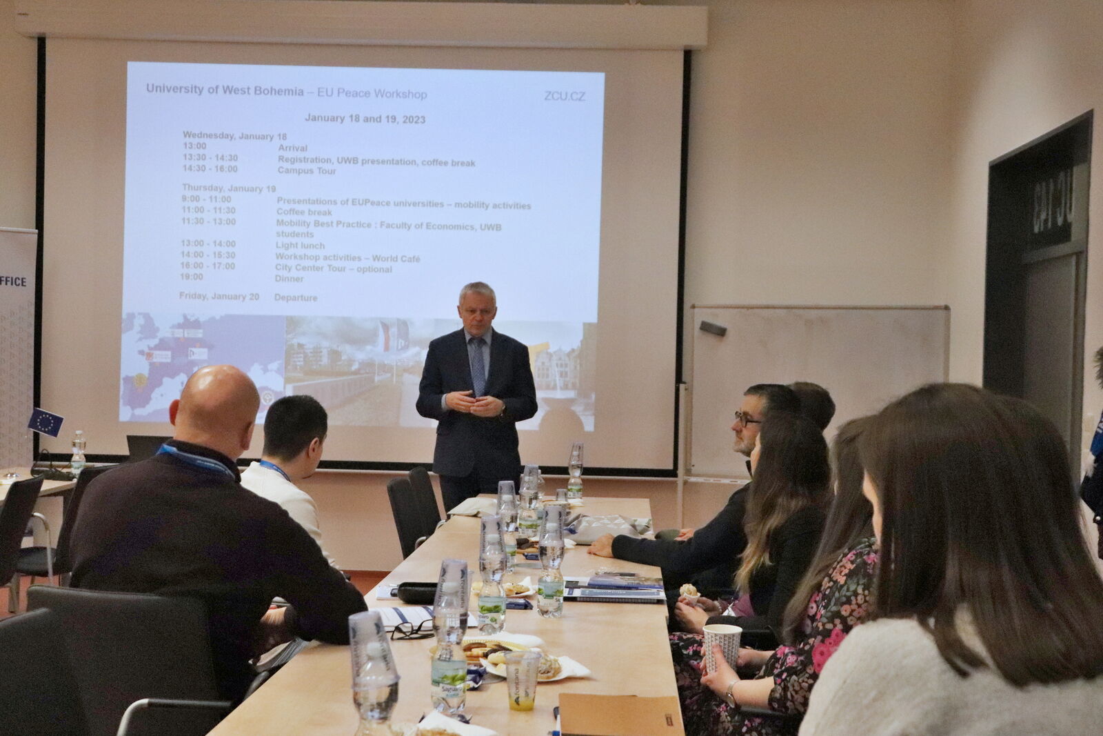 Na Západočeské univerzitě v Plzni minulý týden proběhl dvoudenní workshop pro kolegy z partnerských univerzit EUPeace, kteří se zabývají oblastí mobilit a dalších mezinárodních aktivit. Workshopu se zúčastnilo celkem 11 zástupců ze 6 zahraničních univerzit: Universidad Pontificia Comillas, University of Calabria, University of Marburg, Justus Liebig University Giessen, Maynooth University a University of Limoges. Za Západočeskou univerzitu se zúčastnili zaměstnankyně International Office, zástupci Fakulty ekonomické a Fakulty aplikovaných věd, studenti a studentky a zástupci vedení univerzity včetně rektora.